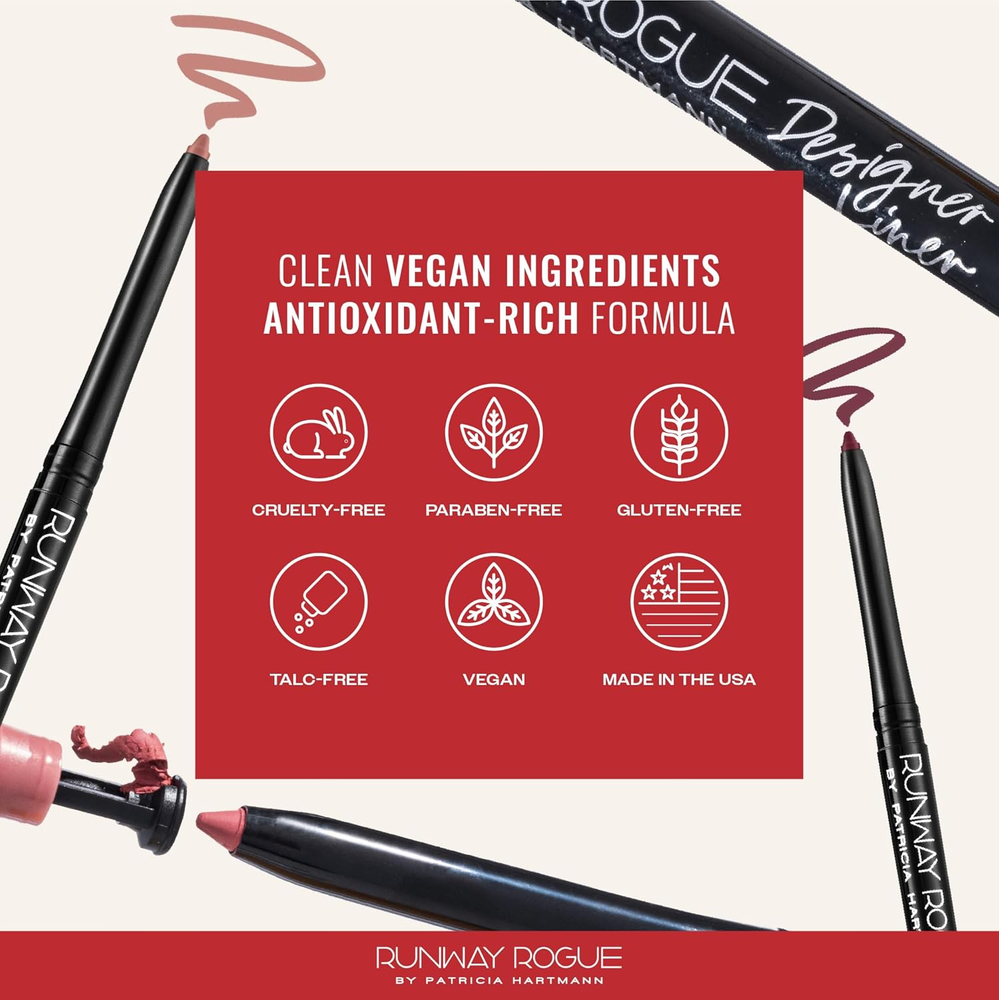 Designer Liner Lip Pencil, Matte Medium Dusty-Rose Lip Liner Pencil and Lip Liner Sharpener, ‘Work It Babe’ MATTE LIP LINER PENCIL: Designer Lip Liner is a creamy matte lip pencil designed to help contour and enhance your natural lip shape, keep your lipstick in place, and prevent lipstick from feathering and bleeding while also improving its long wear and lip color. ‘Work It Babe’ is a medium dusty-rose lip liner shade. SHARP LASTING LIP LOOKS: Make your lip makeup last by using our non-feathering, non-bleeding, and smudge- and water-resistant matte creamy lip liner. Define and fill your lip shape, or wear the color on its own. The built-in sharpener helps with precise application. CREAMY VEGAN FORMULA: A pout you feel good about! Our cruelty-free, vegan lip liner is long-lasting and features anti-aging peptides, smoothing shea butter, and 3D Chroma Technology with palmitoyl tripeptide-1 to help fill in fine lines and visually plump lips. APPLY LIKE THE PROS: Define your lips by lining out toward the corners. Get fuller lips by drawing over the edge of your natural lip line, or fill in the entire lip. Recap to protect the formula. Pair this lip pencil liner with liquid or traditional lipstick, or use it as a lip gloss definer. RUNWAY WORTHY, MADE FOR REAL LIFE: Founded by ’90s supermodel and cover girl Patricia Hartmann, who was mentored backstage by makeup legends, Runway Rogue creates luxurious, easy-to-use lip products for on-the-go women who desire the runway look without the runway hassle. Elevate your every day with Runway Rogue, where glamour meets convenience, and make every moment your real-life catwalk. Product Description The video showcases the product in use. The video guides you through product setup. The video compares multiple products. The video shows the product being unpacked. 1 APPLY LIKE THE PROS 2 DEFINE THE LINE 3 FOR A FULLER LOOK Our Collections Add to Cart Add to Cart Add to Cart Add to Cart Customer Reviews 4.3 out of 5 stars 512 3.9 out of 5 stars 376 4.0 out of 5 stars 852 4.0 out of 5 stars 730 Price $22.00 $ 22 . 00 $29.00 $ 29 . 00 $29.00 $ 29 . 00 $27.00 $ 27 . 00 Finish Matte, creamy Matte meets moisture Shiny, shimmery Silky, shimmery, high-pigment Type Lip liner Lipstick case Tube liquid lipstick Lip gloss Features Smudge- and water-resistant No feathering or bleeding Transfer-proof formula Protects and restores lips Number of Shades 10 7 Silk Glam: 9; Pearl Glam: 8 5 Vegan/Cruelty-Free ✔ ✔ ✔ ✔ Dimensions 1.83 inches x 5.25 inches x 0.88 inches. Weight: 0.32 oz Specifications Item model number DL04 Color Work it Babe Item Form Pencil Product Dimensions 5.25 x 1.83 x 0.88 inches; 0.32 ounces Country of Origin USA Skin Type All Finish Type Semi-Matte Creme Velvet Shipping: Shipped from the USA. Fast delivery within 2–3 days. Payment: PayPal, credit card, bank transfer. Returns: 30-day free return – we cover the shipping cost. Quality: Made in Europe/USA/China. No customs fees. VAT invoice on request. Feedback: You’ll automatically receive positive feedback after payment.