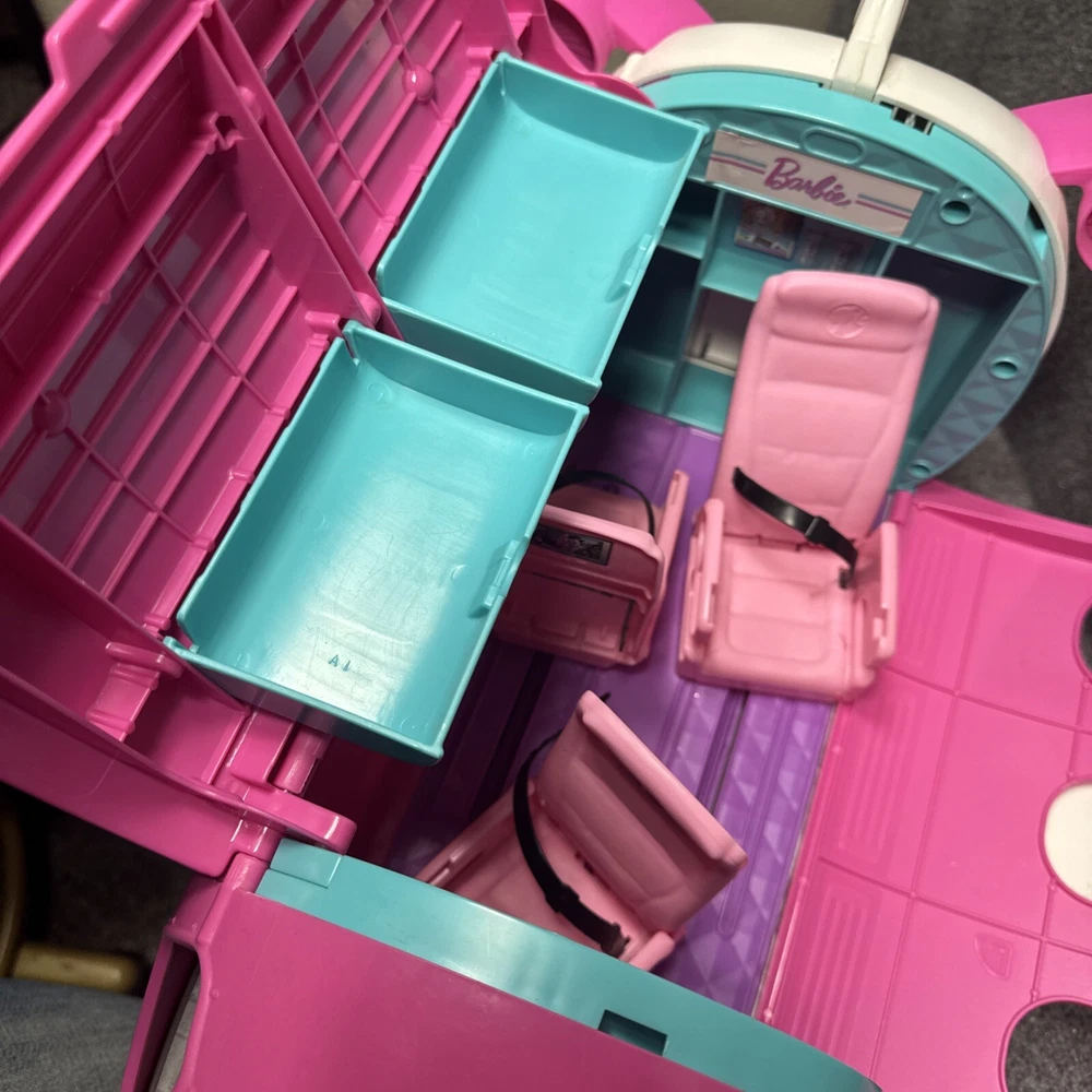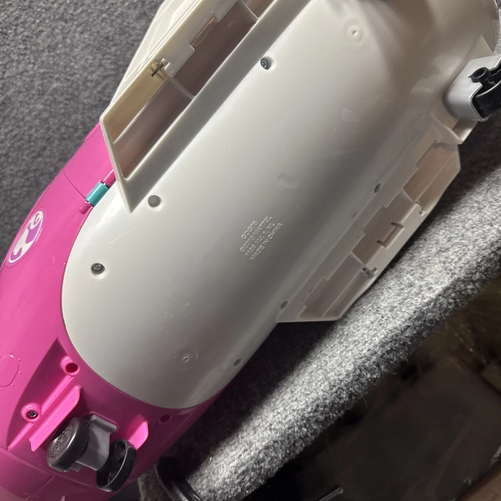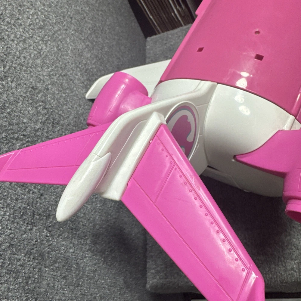The Mattel Barbie Dreamplane Airplane Jumbo Jet Vacation Playset GDG76 is a pink plastic airplane designed for Barbie dolls. Manufactured in 2019, this playset includes a 24" long vehicle with a height of 14" and width of 13". It is part of the Barbie franchise and suitable for 3-4 year olds. Weighing 7.6 lbs, it is an original item compatible with 11-inch dolls.