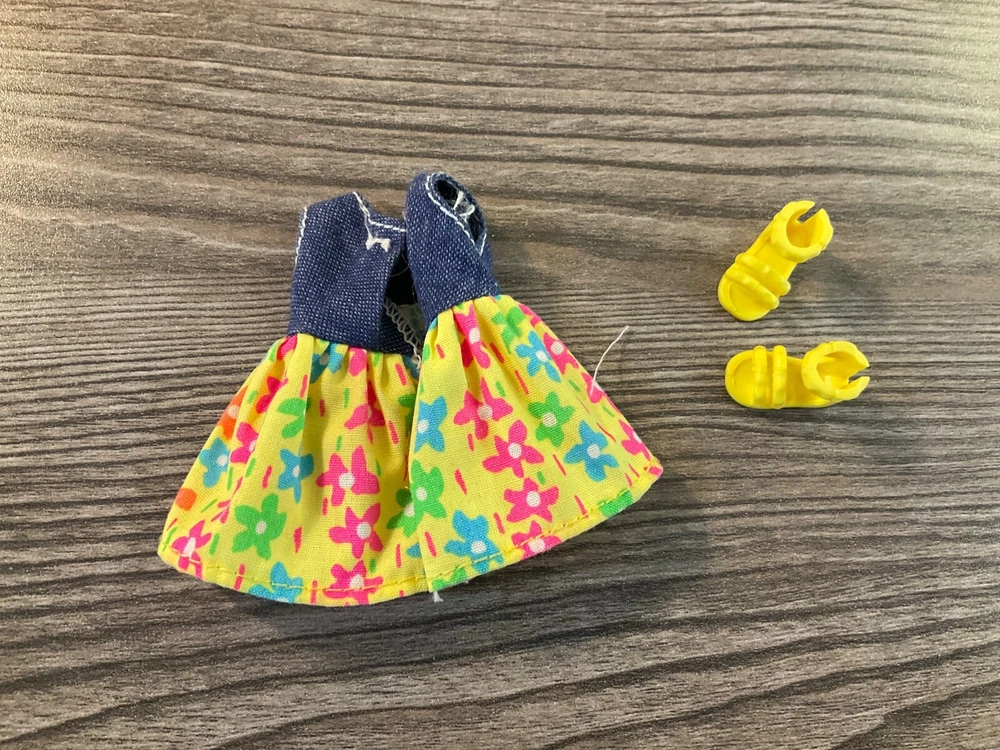 Kelly Doll Outfit This Kelly Clothes Set features A sleeveless dress with denim top and a yellow and multicolor flower print bottom portion Dress has a pink “B” label A pair of shoes are included Set is in Nice Condition ***Please don’t hesitate to make an offer! *** ***Buy It Now :$ 4.50*** OR Best Offer ***Shipping: $ 4.75*** ***Happy to combine shipping for you*** *** Please let me know if you have any question, Happy to help in any way I Can*** ****Please , if you have the time check out my newly opened eBay store. I will be listing many Barbies, clothing, & accessories. As rims goes on I hope to add more fun collectible and vintage items. Like my store to see my newly listed items. Thanks so much!