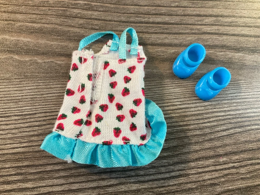 Kelly Doll Outfit This Kelly Clothes Set features A sleeveless white dress with strawberry print on both sides and turquoise ruffles A pair of shoes are included Set is in Nice Condition ***Please don’t hesitate to make an offer! *** ***Buy It Now :$ 4.50*** OR Best Offer ***Shipping: $ 4.75*** ***Happy to combine shipping for you*** *** Please let me know if you have any question, Happy to help in any way I Can*** ****Please , if you have the time check out my newly opened eBay store. I will be listing many Barbies, clothing, & accessories. As rims goes on I hope to add more fun collectible and vintage items. Like my store to see my newly listed items. Thanks so much!