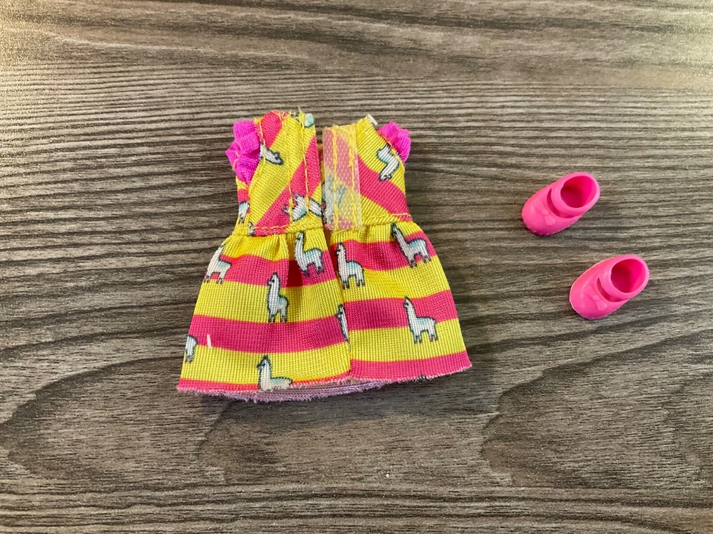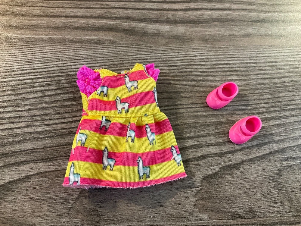 Kelly Doll Outfit This Kelly Clothes Set features A sleeveless pink and yellow striped dress with llama print on both sides A pair of shoes are included Set is in Nice Condition ***Please don’t hesitate to make an offer! *** ***Buy It Now :$ 4.50*** OR Best Offer ***Shipping: $ 4.75*** ***Happy to combine shipping for you*** *** Please let me know if you have any question, Happy to help in any way I Can*** ****Please , if you have the time check out my newly opened eBay store. I will be listing many Barbies, clothing, & accessories. As rims goes on I hope to add more fun collectible and vintage items. Like my store to see my newly listed items. Thanks so much!