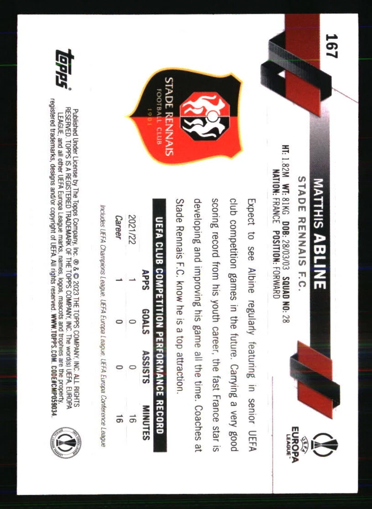 Manufacturer: Topps Team: Stade Rennais FC Graded: No Card Number: 167 Autographed: No Player|Athlete: Matthis Abline Sport: SOCCER Season: 2022 Year Manufactured: 2022 Type: Sports Trading Card Set: 2022-23 Topps UEFA Club Competitions 1st Edition