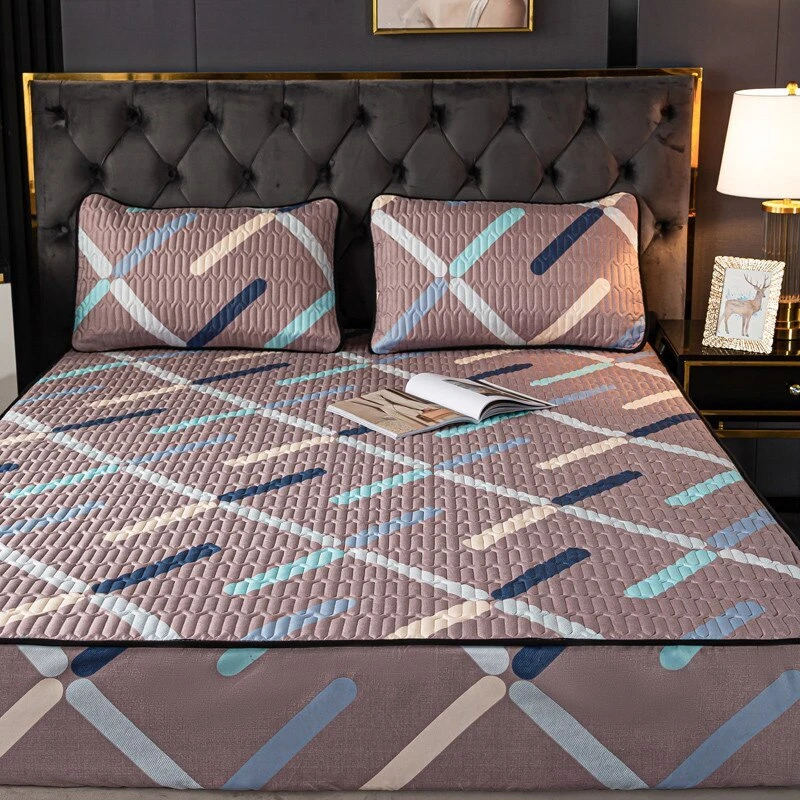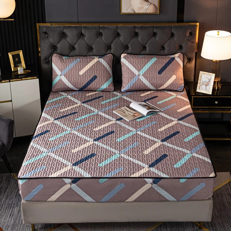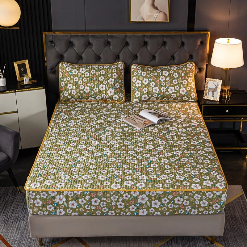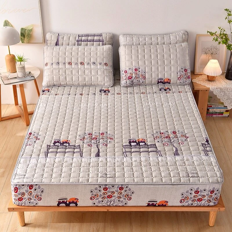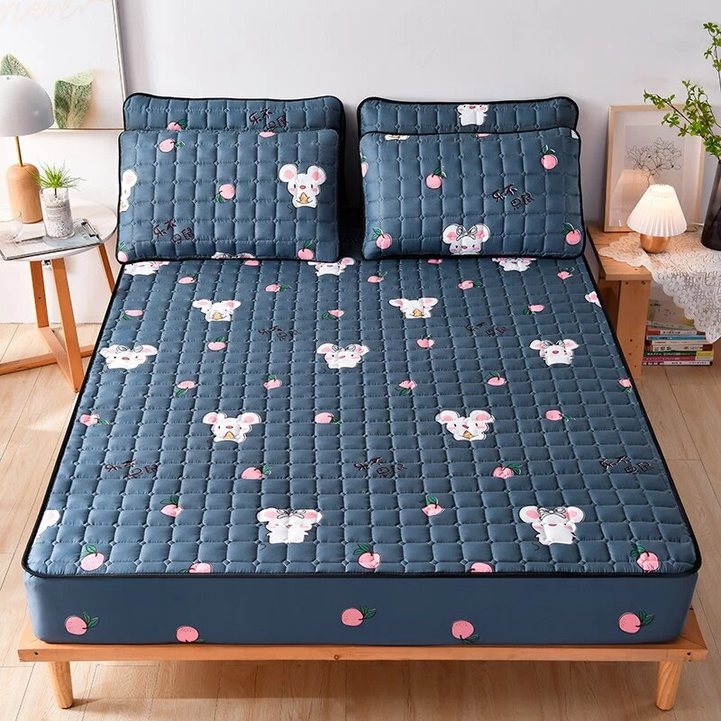 Mattress Cover Quilted Fitted Bed Sheet Printed Non-slip Sheet +2pcs Pillowcases