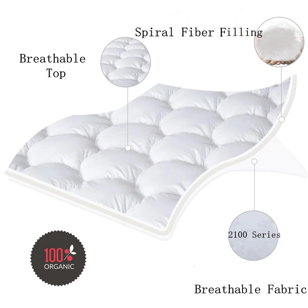 Breathable Cooling Effect: Crafted with breathable 2100 series , the mattress pad cover promotes excellent airflow and heat dissipation. This feature helps keep your mattress cool and dry, ensuring optimal sleep conditions, even during hot summers or warm seasons. Enhanced Sleep Comfort: Our mattress pad features a 5D & 7D spiral fiber filling that provides exceptional softness and support, ensuring a more comfortable sleep experience. The meticulous stitching and sturdy edges enhance its resilience. Size & Deep Pocket Design: Queen 60”x80”. 130GSM single-track elastic fabric pocket will fit up perfectly to 8-21”mattress, preventing any slipping or shifting, allowing you to toss and turn freely. Providing protection against wear and stains for your mattress. Instructions For Before Use: The Mattress pad is vacuum packed when shipped. Wash it and dry using low temperature to return the pad to normal thickness Maintenance & Guaranteed: Machine washable. 1-Year Warranty, Customer satisfaction is our top priority. If you are not satisfied, please feel free to contact us. We will try our best to offer satisfactory solutions