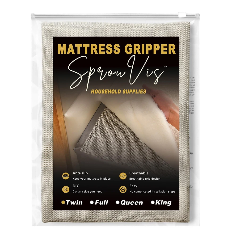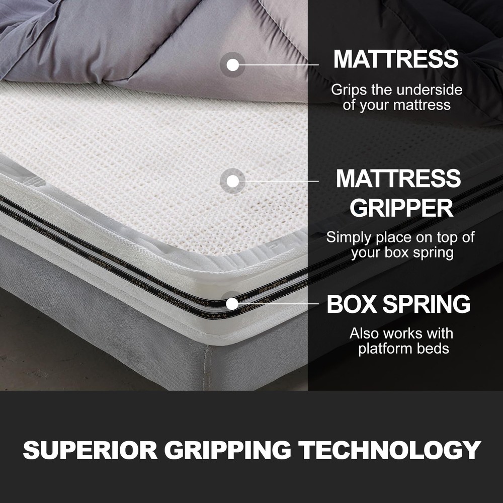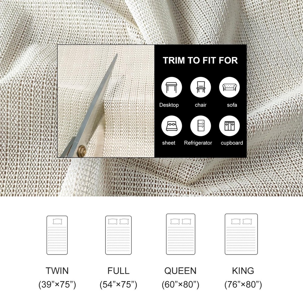 Mattress Nonslip Pad is the ultimate solution to help prevent slipping and sliding mattresses. it firmly grips both your mattress and your box spring to help prevent sliding designed to hold even the heaviest mattresses in place. 【Dual Sided Grip Pad】The Mattress Pad is the ultimate solution for preventing slipping and sliding mattresses. This slip-resistant pad is powered by its unique dual-sided grip, which firmly holds both your mattress and your box spring in place. It is designed to ensure even the heaviest mattresses stay put, allowing you to wake up refreshed and ready for a brand new day. 【Versatile Usage】This grip pad is not limited to just mattresses. It works effectively in holding platform bed frames, box springs, daybeds, and futons securely in place. Additionally, it can be used to secure sofas, carpets, and rugs, providing stability and preventing them from sliding. 【Customizable】The pad is easy to cut to custom sizes using a simple pair of scissors. You can trim it to fit whatever size you need, ensuring a perfect fit for your specific requirements. 【Strong and Effective】Made of 1.5mm thick soft material, this grip pad is perfect for any furniture. It creates a protective covering for all types of flooring, providing stability and preventing any damage or scratches. 【Breathable Design】The open weave construction of this grip pad allows for maximum air flow, effectively preventing moisture buildup and promoting a fresh sleeping environment.