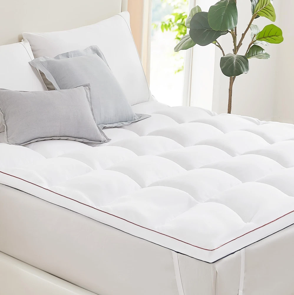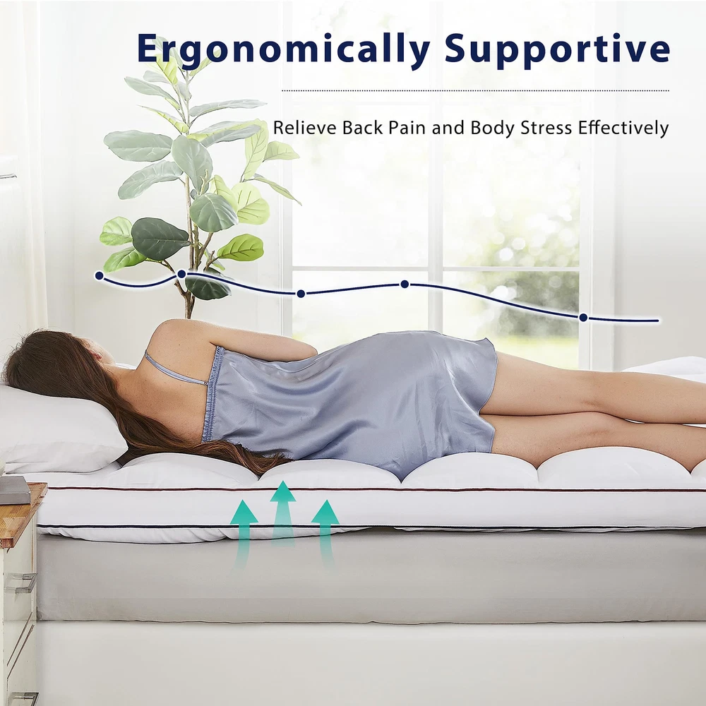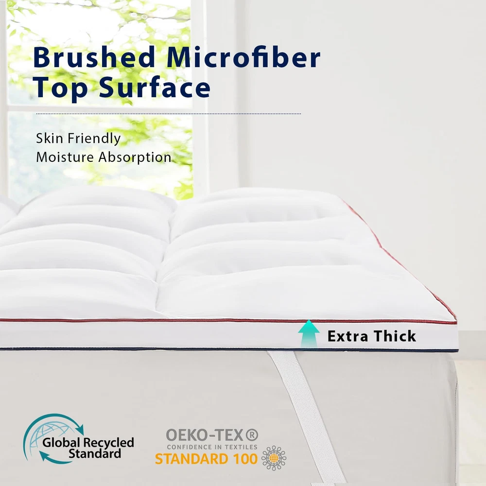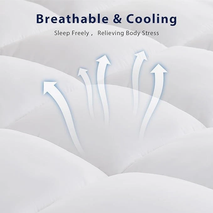 PREMIUM MATERIAL:This twin mattress topper is made out of a 100% Microfiber fabric surface and plush-thickened 3D Alternative filling. The pad is certified with Oeko-Tex 100 without harmful ingredients and odour. We believe the luxury material provides an extra soft feeling. EXTRA THICK & CLOUDY FLUFF:This cooling mattress pad uses sophisticated textile technology and ultra-soft 3D Alternative fillings which make the pillow-top mattress topper more breathable and cool all night for hot sleeper. The extra thick design perfectly fits any body better, helps alleviate back pain, and reduces from body pressure. It is like sleeping on a cloud. PERFECT FIT & STABLE ALL NIGHT:This mattress topper adopts stable elastic band which stretches from 8" to 21" , ensuring a secure fit for all mattress sizes and allowing you to toss and turn freely at night,The simplistic design will more profit with your bedroom. The box quilting construction prevents the evenly distributed fillings from shifting as you sleep to offer you the most consistently soft comfortability. MACHINE WASHABLE & EASY MAINTAINANCE:The feather mattress topper twin is machine washable, and after receiving it,we recommend airing it out for 72 hours to reach its fullest potential. To make the mattress fluffier: 1. Pat or shake it by hand from different directions. 2. Tumble dry on low heat for 15 minutes. This plush mattress topper is easy to care for, so you can feel free to use it. IS OUR PRIORITY:Our aim is to provide a satisfying . The toppers are dusted twice before leaving the factory, so if you have any problems, please do not hesitate to us. We hope to bring you a comfortable sleeping experience.