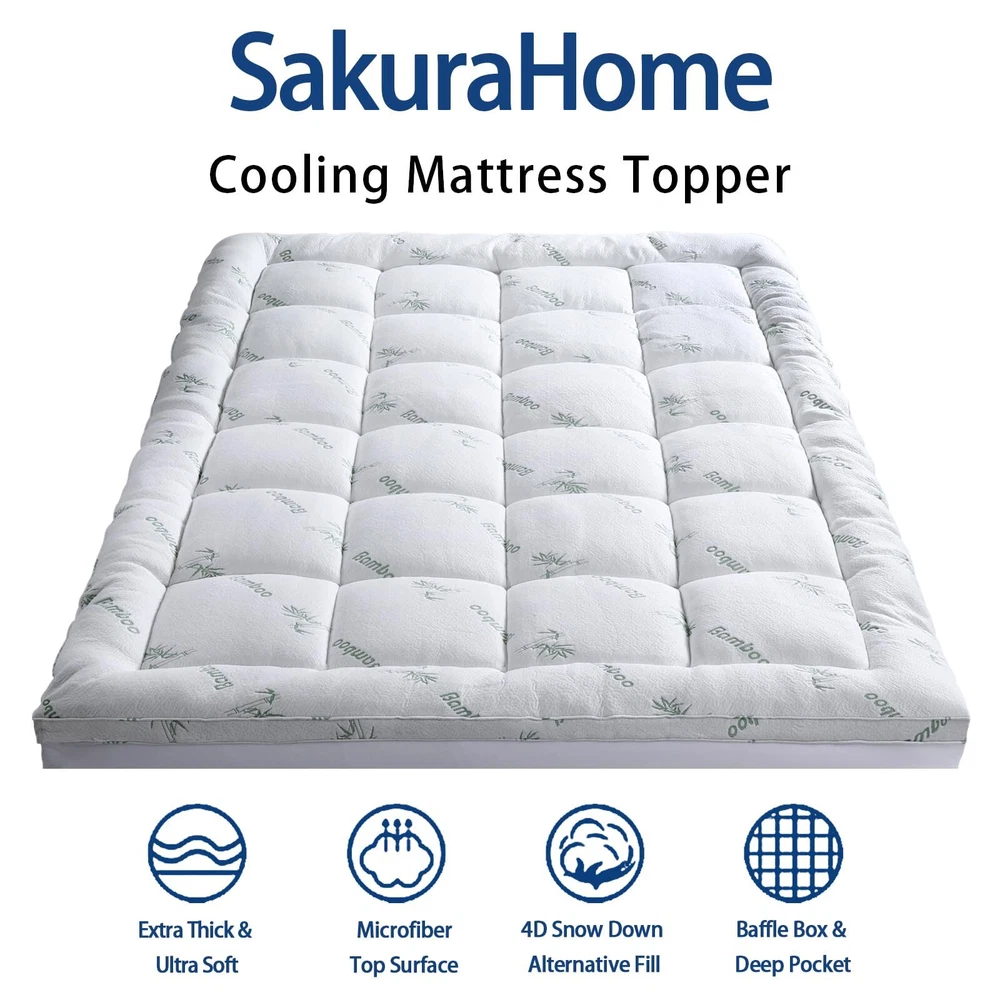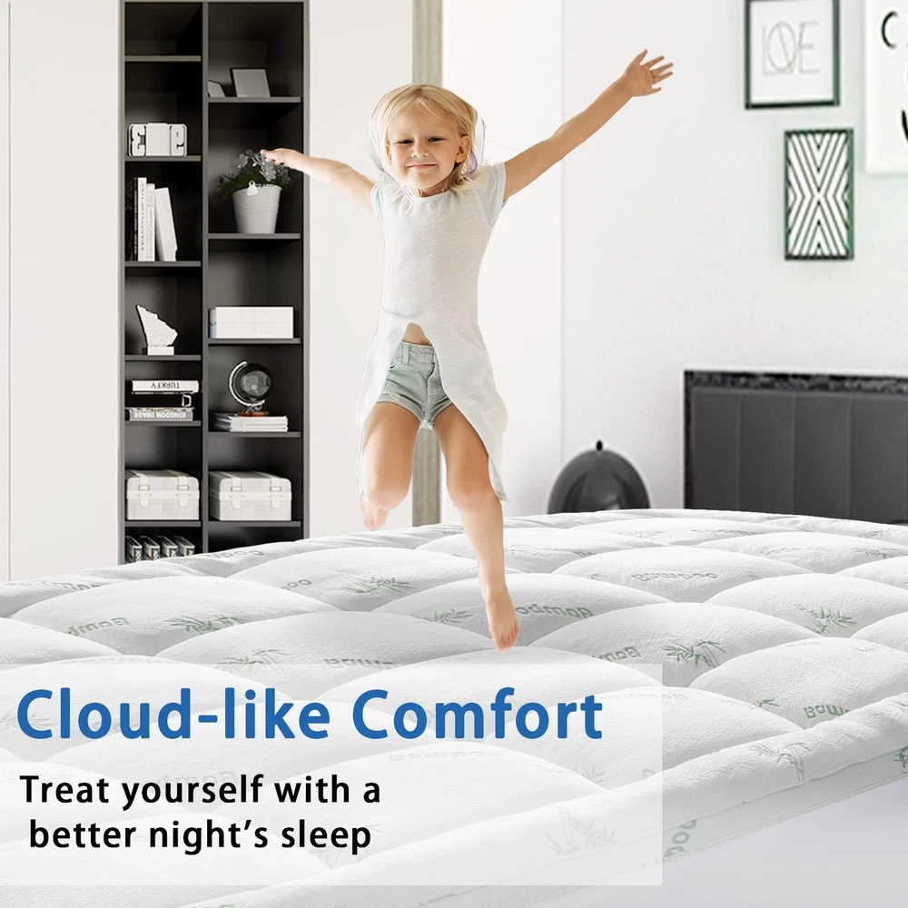 Why choose our Viscose Made from mattress topper? Upgrade your mattress pad with less expense 1.Premium extra plush mattress topper is constructed from blended Viscose Made from fabric which is silky to the touch and allows for a more comfortable nights sleep 2.With 1000GSM down alternative filling, the product is heavier, thicker and more fluffy. Provides exceptional softness, comfort and support 3.The pad is equipped with an all-around elastic skirt for a perfect tight fit on your mattress 4.it will come out fluffy and clean after washing and drying. Economical and sustainable Size: Twin Size: 39 x 75 inch Twin XL Size: 39 x 80 inch Full Size: 54 x 75 inch Queen Size: 60 x 80 inch King Size: 78 x 80 inch California King Size: 72 x 84 inch 【 MATTRESS TOPPER】: With 1000GSM of premium fluffy loft, this hotel quality bed topper will transform your mattress from ordinary to unparalleled comfort and supreme softness - while maintaining outstanding support and cushioning. 【COOL & BREATHABLE】: Encased in 40% of the smoothest, silky soft breathable Viscose Made from fabric, our mattress topper is designed to deliver excellent ventilation and evenly distributes heat to prevent you from feeling hot and sweaty. 【ELASTIC DEEP POCKET FITTED SKIRT】: Our elasticated deep pocket skirt will wrap tightly around your mattress and accommodates depths from 8-21 inches. This clever skirt works exactly like a fitted sheet to ensure your mattress topper will remain securely in place. 【Machine Washable & easy Care】: Be it sweat or stains, you will never get them out of topper or expensive mattress. This mattress topper will take care of them all. If it gets dirty, just throw it into a commercial washing machine, it will come out fluffy and clean after washing and drying. No expensive dry cleaning necessary. Economical and sustainable. 【100% Customer Satisfaction】:Please leave it several hours before use or just put it in a dryer machine for fluffier. We provide100% satisfaction after sale service, if there is anything wrong with your order, just feel free to us, we will make every effort to solve your problem.
