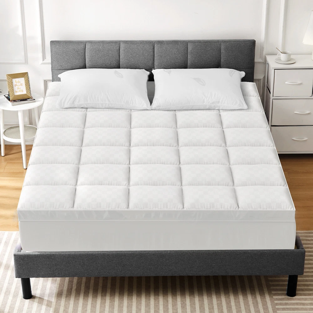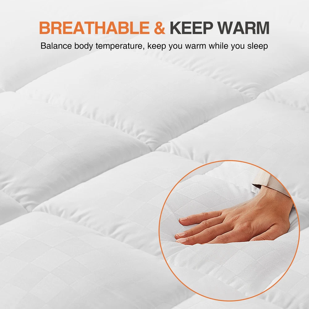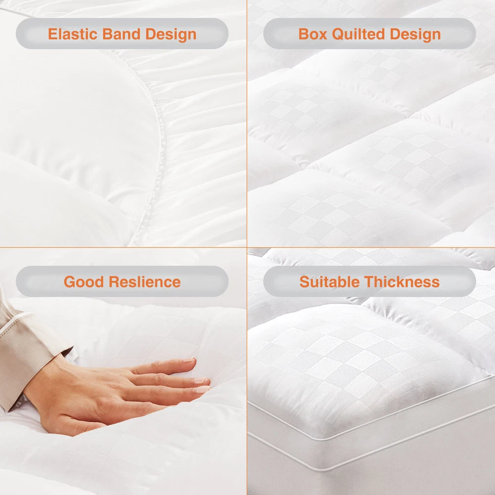Product Description This pillowtop mattress topper full is filled with 5D virgin fibers to ensure comfort and thickness, providing adequate support for the body, distributing weight evenly, and preventing sagging, making the mattress covers ideal for side, back or stomach sleepers. There are four sizes for you to choose: Queen, Full, Twin, King, and has a soft and comfortable fabric that wicks away sweat and breath, reducing the stuffiness associated with memory foam mattresses or foam mattresses. In addition, the soft pillow top mattress features a unique square quilting design that secures the padding in each square and is not easy to shift. This cool king topper can fit 8-21" high mattresses on the market, the elastic band design can wrap it 360 degrees, and no matter what activities you do on the bed, the mattress can stay still. In addition, the neat stitching improves durability and allows you to wash the hotel mattress topper many times without warping or tearing it. No more worrying about stains on your mattress! This down mattress topper of ours can easily solve these problems, you just need to put it into the washing machine, and after washing and drying bed topper will be restored as before, become clean and fluffy, and very easy to maintain. This mattress cooling topper has been certified by OEKO-TEX Standard 100, safe, comfortable, skin-friendly, and hypoallergenic, it is a great gift for yourself, family, and friends. We also have an excellent customer service team, if you have any questions, please feel free to contact us. We want to give you the best shopping experience with this extra-thick mattress. Color White Size Twin/Full Fabric Type Cotton/Microfiber Special Feature Machine/Hand Washable Closure Type Pull On Product Care Instructions Machine Wash Water Resistance Level Not Water Resistant Age Range (Description) All Age Material Cotton/Microfiber Product Dimensions 75 x 39 x 2 inches / 75 x 54 x 2 inches Item Weight 5.2 lb / 7.36 lb Package include: 1* Mattress Topper