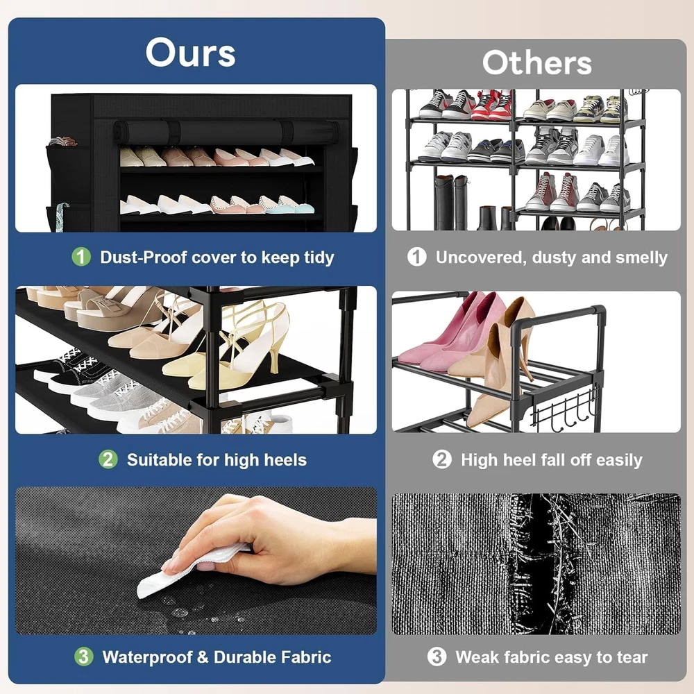 LARGE CAPACITY SHOE RACK: This 10-tier shoe rack measures 33.5'' W x 11.2'' D x 68.7'' H, offering ample storage space for your shoes. Its design helps keep your floors clutter-free and makes organizing your footwear a breeze SHOE RACK WITH DUSTPROOF COVER: This tall shoe rack with cover features a dustproof cover, ensuring your shoes stay clean and protected from dust and pets. The closed design is suitable for maintaining a tidy and hygienic shoe cabinet STURDY SHOE ORGANIZER: Made from a metal frame, non-woven fabric, and durable plastic connectors, this shoe organizer is sturdy and built to last. It provides excellent carrying capacity, making it a reliable shoe closet solution for your home FUNCTIONAL SHOE STORAGE: With adjustable tier, this shoe storage allows for easy organization of various shoe types, including sneakers, heels, boots, and sandals. The removable tier feature offers flexibility, and the 8 pockets are ideal for storing ties, keys, wallets, and small items SPACE-SAVING SHOE CLOSET: This vertical shoe rack efficiently utilizes space, making it suitable for small areas. Its free-standing design is ideal for use in closets, front door entrances, garages, hallways, dorms, bedrooms, living rooms, or as a zapateras organizer for entryways