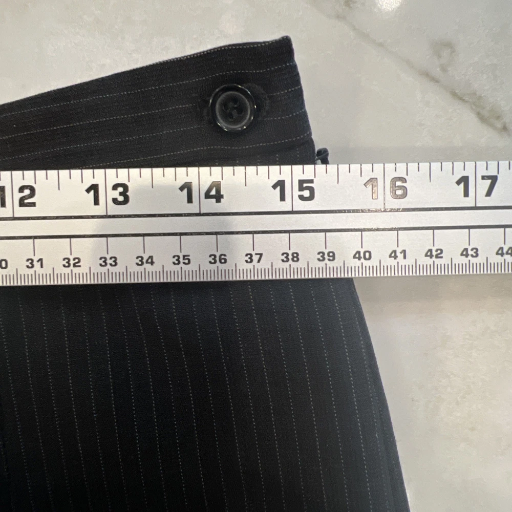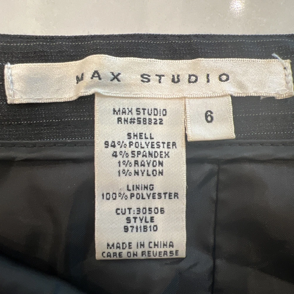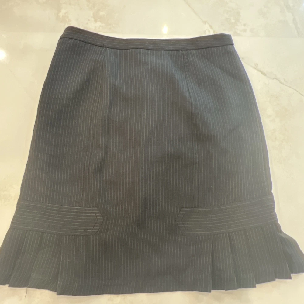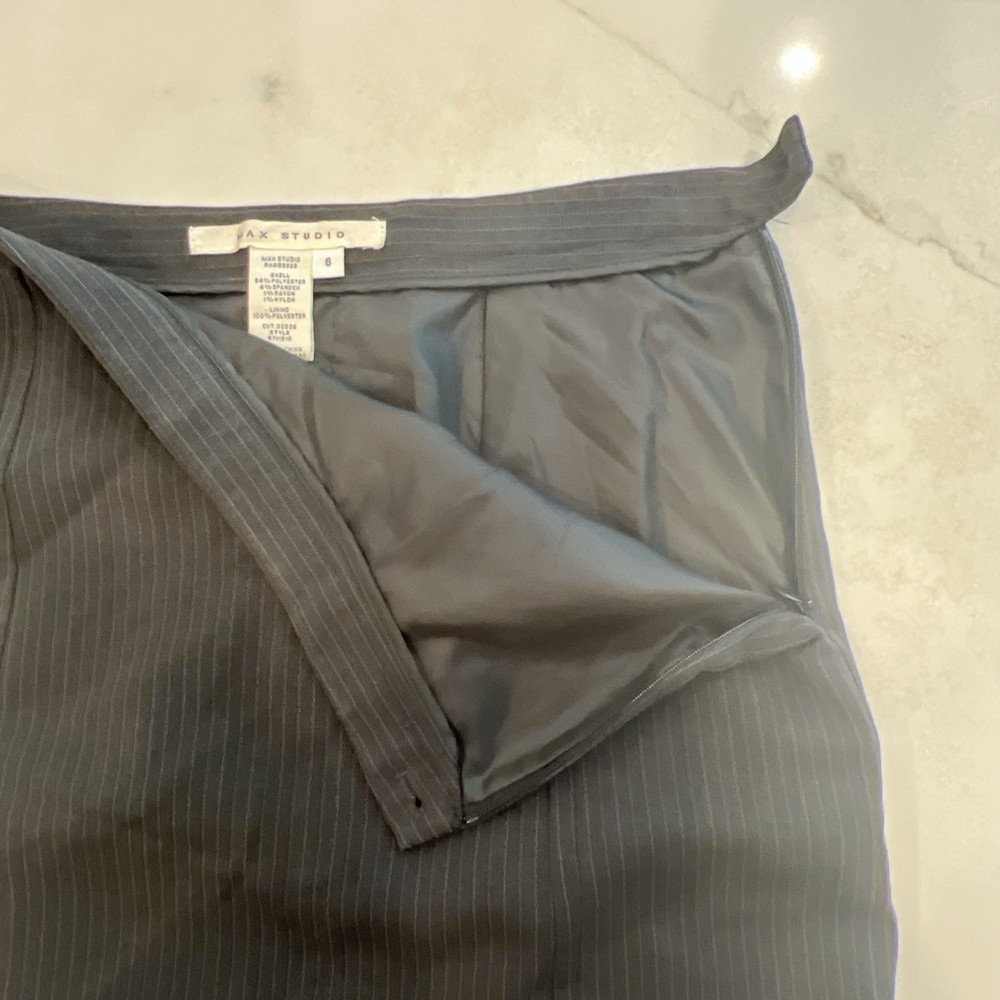 Chic and sophisticated, this Max Studio gray pinstripe skirt features tailored pleat detailing near the hem and a side zip with a button closure at the waistband. Ideal for office wear or professional settings, the skirt offers a polished, fitted silhouette with comfortable stretch. • Brand: Max Studio • Size: 6 • Color: Gray with white pinstripes • Style: Straight pencil skirt with pleated hem accents • Closure: Side zipper with button • Material: Shell – 94% Polyester, 4% Spandex, 1% Rayon, 1% Nylon | Lining – 100% Polyester • Condition: Excellent pre-owned condition. Please see all photos for full details and measurements. Ships fast from a smoke-free home! Please feel free to reach out with any questions.