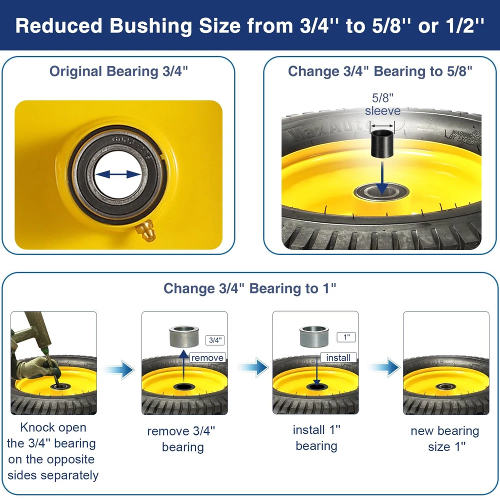 MaxAuto 2Pcs 16x6.50-8 Front Tires and Wheels Assembly for Lawn Mower Tractors, 3" Offset Long Hub with 3/4"Bearings, Pneumatic Tire, Tubelless 【Parameter】Tire Size: 16x6.50-8"; Hub Type: Offset Hub; Hub Length: 3"; Bearing Diameter: 3/4"; Load Capacity: 615lbs; Type: Pneumatic Tire (!!!Tire equipped with Grease fitting, and Air Valve!!!) 【Application】16x6.50-8 front tires and wheels Fits on Models: G110; 145 Tractor; 190C Tractor; LA130; LA140; LA150; X140; LA165; D160; X165; X166; Don't fit for Model 130/ X300R/X530.16x6.50-8" Pneumatic Tubeless Tire replacement for front lawn tractor and garden tractors. By right parts sizes, This lawn mower tire also fits wheelbarrows, garden carts, hand trucks, generators, air compressors, wagons, pressure washers and other types of outdoor power equipment. 【Feature】16x6.50-8" pneumatic tubeless tire take the cake in the mobility category. Since these tires are filled with air, they provide better traction and a much smoother ride. Since these tires are more efficient, they allow the wagon, mower, or cart to maximize speed. 【Package Include】1 Set = 2 Piece 16x6.50-8" Lawn Mower Tires and Wheel.!!!NOT for highway use!!! 【Note】】Prior to purchase, please check the size of the original tire on your vehicle to ensure the size of the tire to be purchased is correct.To be specific, only if Tire Size, Hub Length, Hub Type and Bushing Diameter are all matched, can this product be compatible. Otherwise, it would be incompatible. Specification: Size:Tire 16X6.50-8 Wheels 8X5.375 Tire & Wheels Assembly Ply Rating:4PR TT/TL:TL Max Load(Lbs):615 PSI:28 Load/Speed Index:9A3 Tread Depth (mm):5.5 Rim Width (in):5.375 Section Width(mm):167 OD(mm):415 Wheel: 8x5.375 Wheel with Precision bearings Color: John Deere Yellow Feature: --Easy to install and easy to use --Act as a spare or replacement of the broken one --A perfect combination of premium rubber material and sophisticated workmanship Package Included: 2 tires & rim wheels assembly Shipping We offer FREE shipping on all orders! We use a selection of shipping services such as UPS, FedEx, USPS etc. We only ship to the lower 48 states, no APO/FPO addresses or PO Boxes allowed. Local pickups and combined shipping options are not provided at this time. Return You can return a product for up to 30 days from the date you purchased it. Any product you return must be in the same condition you received it and in the original packaging. Please keep the receipt. Payment We accept payment by any of the following methods: PayPal Please pay as soon as possible after winning an auction, as that will allow us to post your item to you sooner! Feedback Customer satisfaction is very important to us. If you have any problem with your order, please contact us and we will do our best to make you satisfied. Contact Us If you have any queries, please contact us via ebay. We usually respond within 24 hours on weekdays. Please visit our eBay store to check out other items for sale! Thank you for shopping at our store.