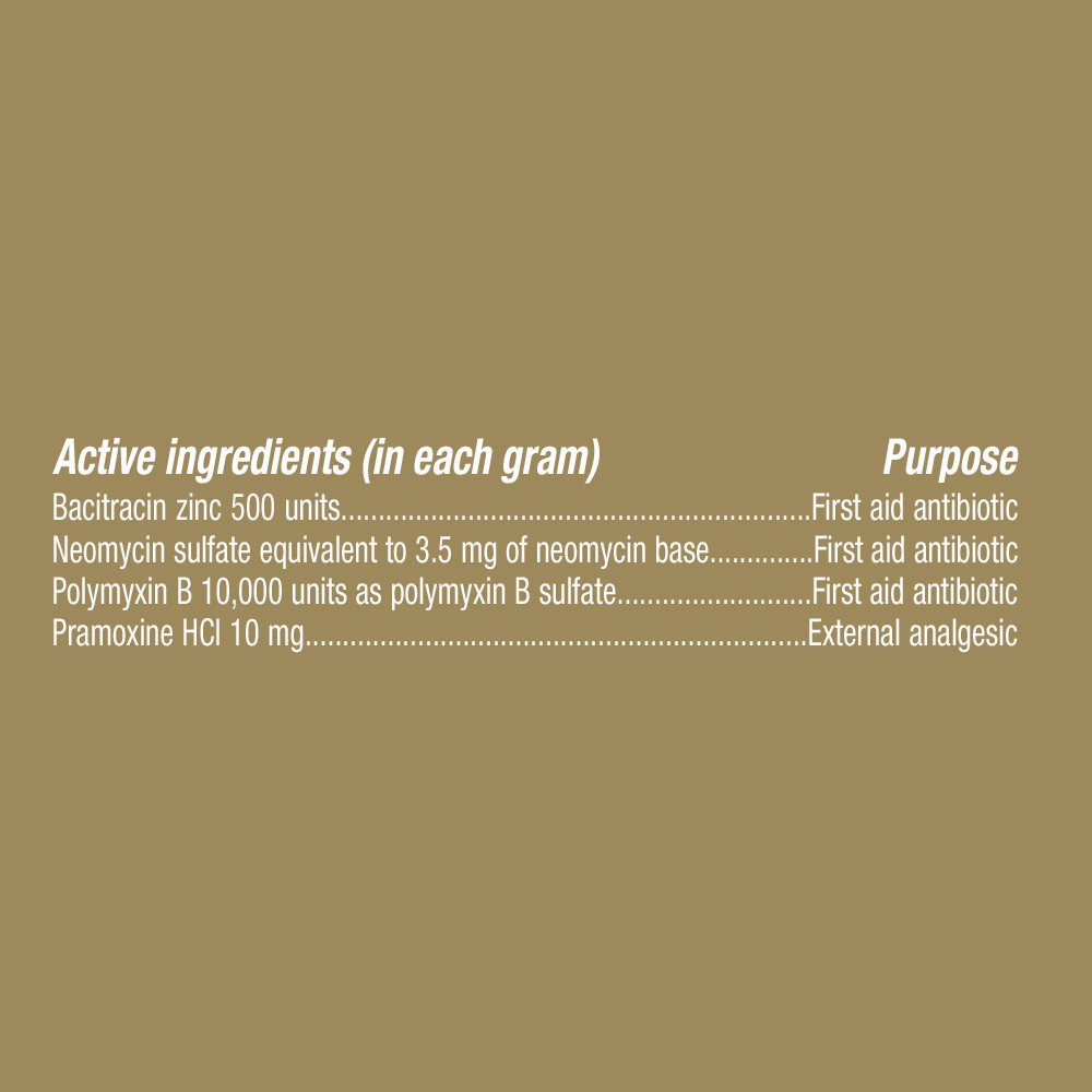 ACTIVE INGREDIENTS: Compare to the active ingredients in Neosporin + Pain Relief OINTMENT CONTAINS: Bacitracin Zinc, Neomycin Sulfate, Polymyxin B Sulfate, Pramoxine HCl DIRECTIONS: adults and children 2 years of age and older: Clean the affected area and apply a small amount (an amount equal to the surface area of the tip of a finger) of GoodSense Triple Antibiotic Ointment on the area 1 to 3 times daily. May be covered with a sterile bandage. Children under 2 years of age: ask a doctor. INJURY: It is a general term that refers to harm caused by accidents, falls, hits, weapons, and more. Injuries can happen at work or play, indoors or outdoors. MAXIMUM STRENGTH: antibiotic ointment that helps prevent infection and relieves pain in minor Cuts, Scrapes and Burns Compare to Neosporin® + Pain Relief active ingredients. First Aid Antibiotic Pain Relieving Ointment active ingredients are bacitracin zinc, first aid antibiotic; neomycin sulfate, first aid antibiotic; polymyxin B sulfate, first aid antibiotic; and pramoxine HCl, external analgesic. Soothes painful cuts, scrapes, and burns. Triple antibiotic infection protection. Helps skin heal to look healthy.