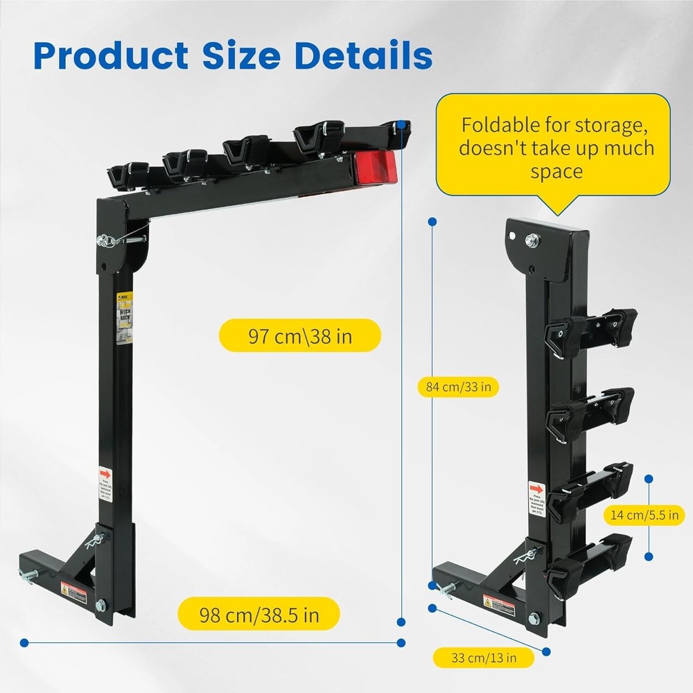 About this item Secure Bike Transportation: Safely transport up to 4 bikes with ease. The rack's towing capacity is 150 lbs and includes a hitch pin for secure attachment. An added reflector enhances safety during travel Convenient Swing-Down Feature: The swing-down feature provides effortless access to the rear of your vehicle, ensuring convenience when needed. Ideal for vans, SUVs, pickup trucks, and sedans with receiver hitches Easy Installation: Installing the MaxxHaul Towing Products 70210 Deluxe 4-Bike Hitch Mount Rack is a breeze and takes just minutes. The support arms, equipped with adjustable hold-down straps, firmly secure and transport your bikes Broad Hitch Compatibility: This rack fits 2" x 2" hitch receivers, offering versatile compatibility with a variety of vehicles Durable Construction: Built from rigid all-steel construction and powder-coated for durability, this rack is designed for longevity. The adjustable bike cradle with hook and loop straps ensures secure transportation Compatibility Note: Please note that the 70210 Bike Rack is designed for bikes with a horizontal top bar frame. For different style bike frames, the addition or installation of a horizontal crossbar may be necessary (not included) Weight Limit and Reflector: With a towing capacity of 150 lbs, the rack includes a hitch pin and reflector for added safety Product Description Heavy duty all steel construction bike rack will easily transport up to 4 bicycles. Features padded bike cradles with hook and loop straps to protect bike finish. Shipping We offer FREE shipping on all orders! We ship within Three business days of payment, usually sooner. We use a selection of shipping services such as UPS, FedEx, USPS etc. We only ship to the lower 48 states, no APO/FPO addresses or PO Boxes allowed. Local pickups and combined shipping options are not provided at this time. Return You can return a product for up to 30 days from the date you purchased it. Any product you return must be in the same condition you received it and in the original packaging. Please keep the receipt. Payment We accept payment by any of the following methods: PayPal Please pay as soon as possible after winning an auction, as that will allow us to post your item to you sooner! Feedback Customer satisfaction is very important to us. If you have any problem with your order, please contact us and we will do our best to make you satisfied. Contact Us If you have any queries, please contact us via ebay. We usually respond within 24 hours on weekdays. Please visit our eBay store to check out other items for sale! Thank you for shopping at our store. Disclaimer We are working with different suppliers in USA to deliver the item to your doorstep. If you have any issues regarding the item, Feel free to ask.