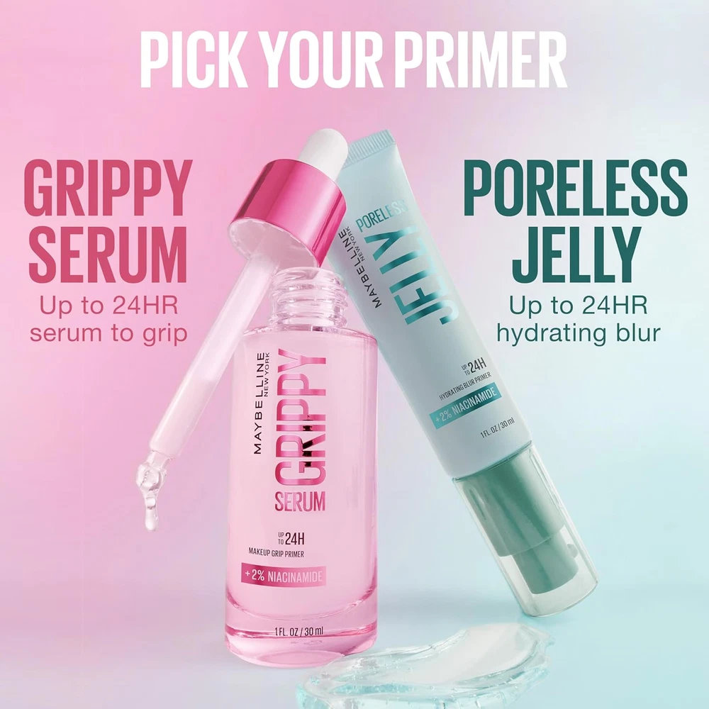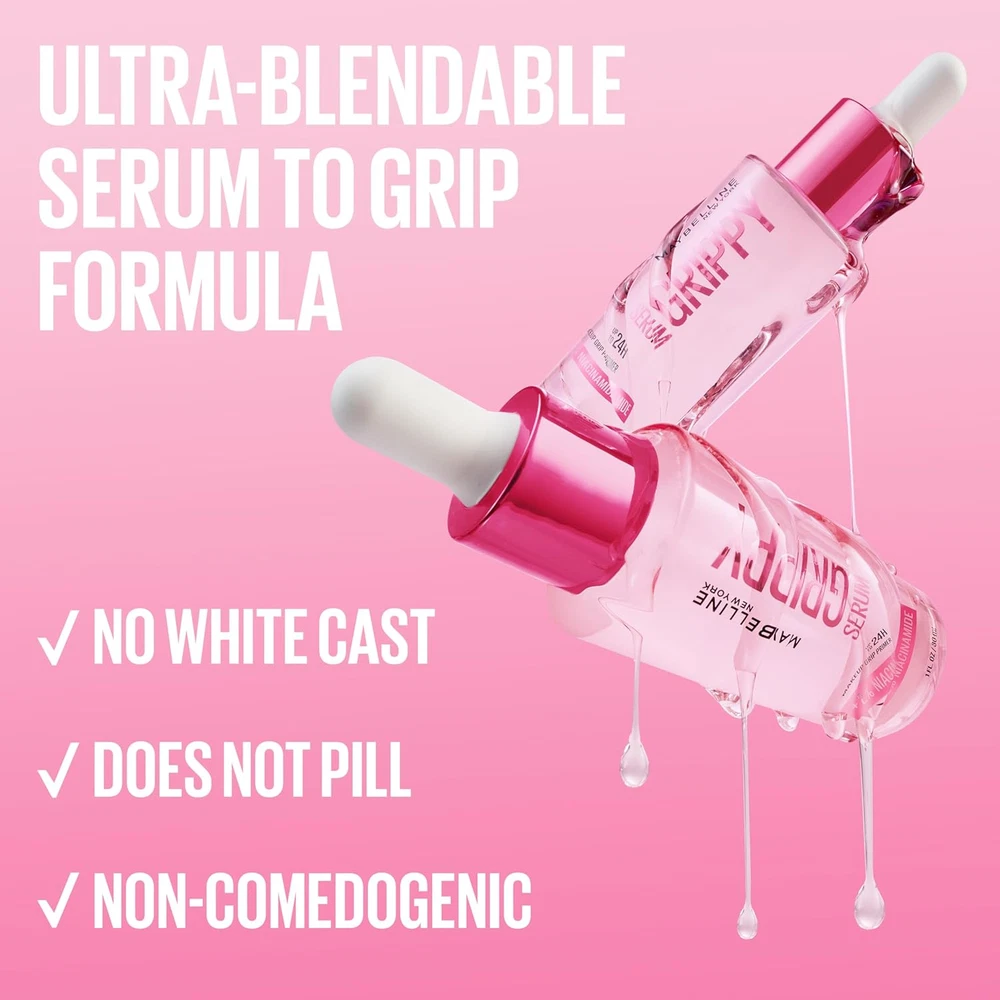 Face Primer For Up To 24H Wear: Drip, glide, grip with Grippy Serum Primer. This face primer for makeup is ultra blendable with Serum-To-Grip technology, after 20 seconds the fresh serum texture transforms to a sticky feel that grips makeup for up to 24H Gripping Water Based Primer Formula: Grippy Serum is a water-based serum make up primer that has been formulated with 2-percent Niacinamide. This hydrating primer delivers 24H hydration and gives a fresh, plumped skin look No White Cast Or Greasy Feel: Apply this primer for face before makeup. Layers well with makeup and does not pill. Our primer face makeup is a non-comedogenic, vegan formula and suitable for all skin types, including sensitive skin Maybelline Has What You Need: Create any look with foundation, BB cream, concealer and highlighter for the perfect canvas, eye shadow, brow pencil, mascara and eyeliner for any eye look and lip products, from matte lipstick to au natural lip gloss Remove Maybelline Makeup With Micellar Water: Use Garnier Micellar Water as a gentle makeup remover at night, and as a facial cleanser in the morning to prep skin for Maybelline makeup Meet Grippy Serum, Maybelline New York’s up to 24H makeup grip primer. This makeup primer is ultra blendable with Serum-To-Grip technology, after 20 seconds fresh serum texture transforms to sticky feel that grips makeup for up to 24H. It’s formulated with 2-percent niacinamide, delivers 24H hydration and gives a fresh, plumped skin look. Just drip, glide, grip! Vegan formula, no animal-derived ingredients. No white cast. No greasy feel. Does not pill. Non comedogenic. Layers well with makeup. Suitable for all skin types, including sensitive skin.