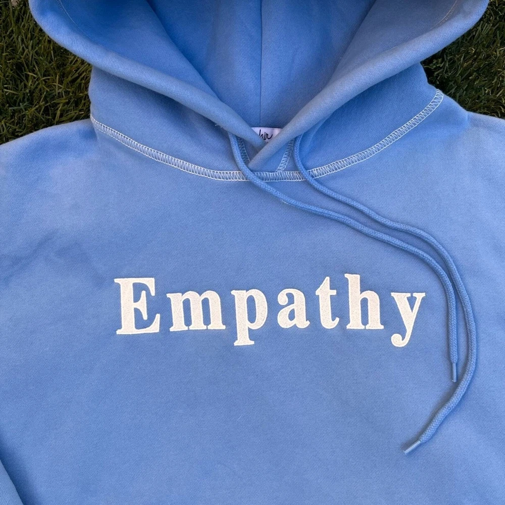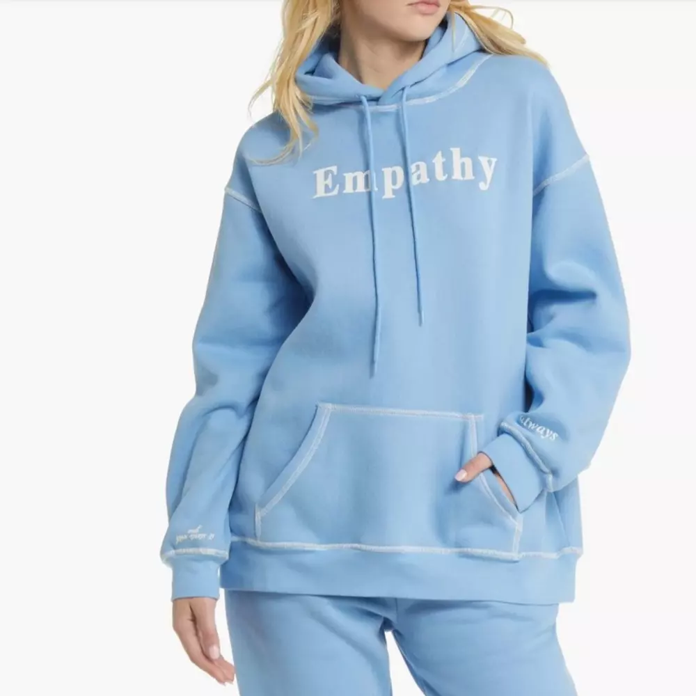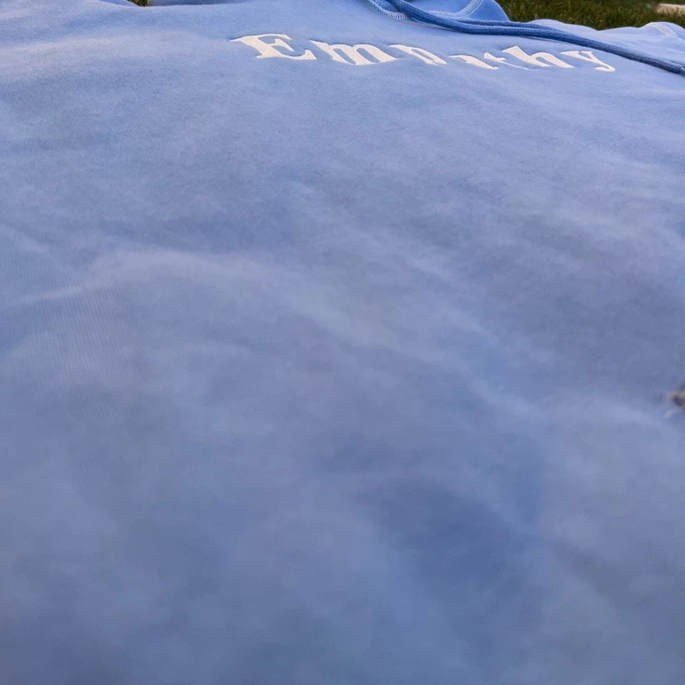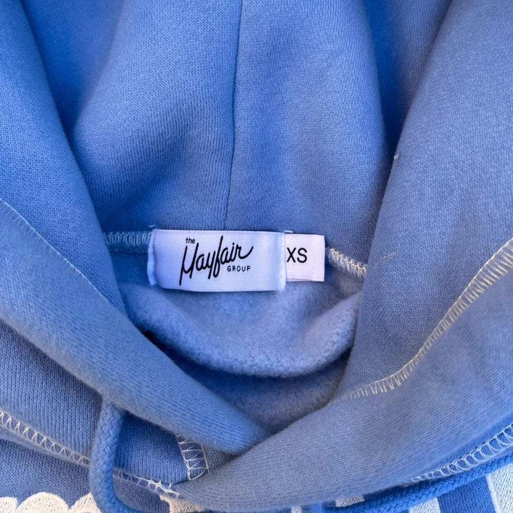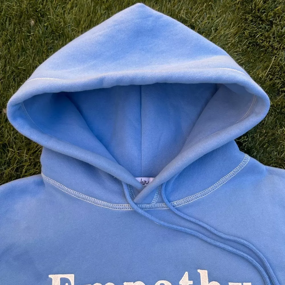 Pre-Owned pull over hoodie sweatshirt by Mayfair Group Style is the Empathy Always Hoodie Color is Baby Blue and white Size extra small, oversized unisex fit Measurements: Pit to Pit 25 inches Length 27.5 inches Arm Length Inseam 20 inches Light blue baby blue Vintage Y2K Hiphop Streetwear vibes, from this on tread unisex brand that supports mental health and self care. Universal positive messaging, with on-tread minimalist styling. Thick and warm, this mid weight sweatshirt is perfect for lazy days in the winter, or a cozy school outfit with its oversized relaxed fit.