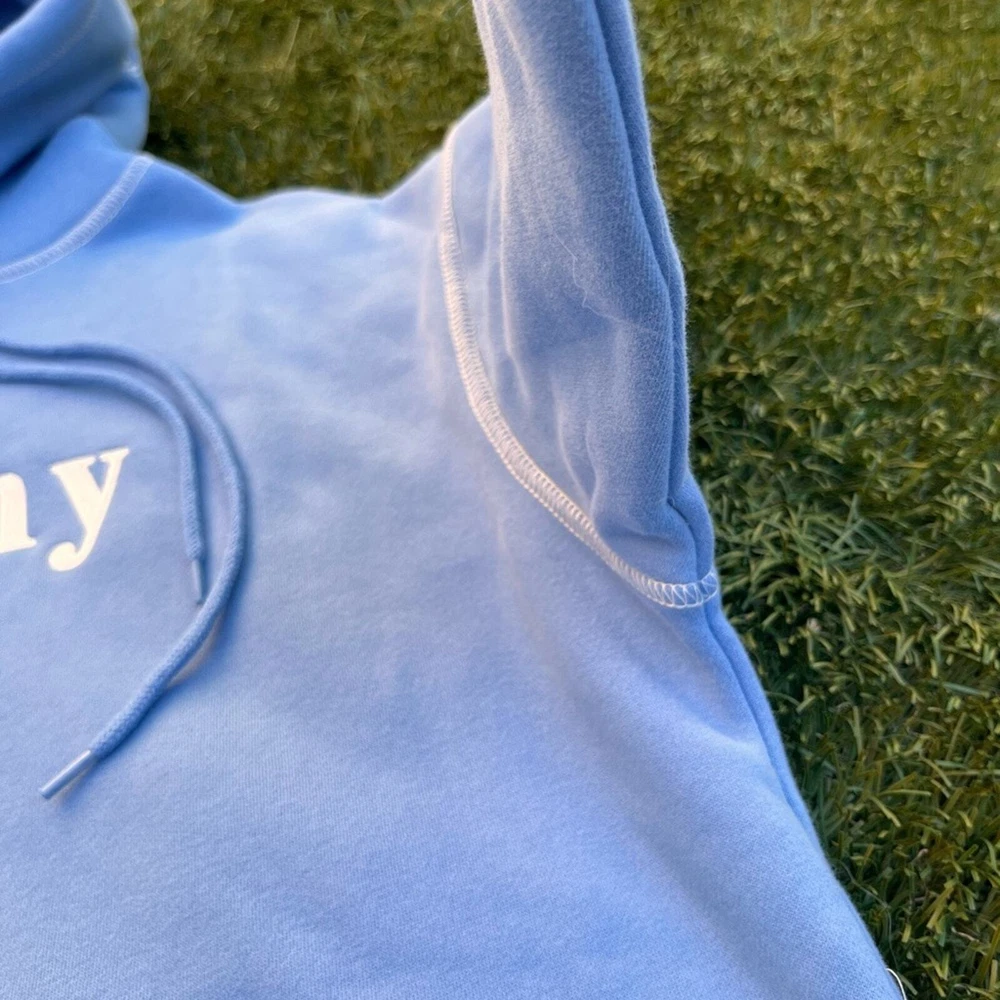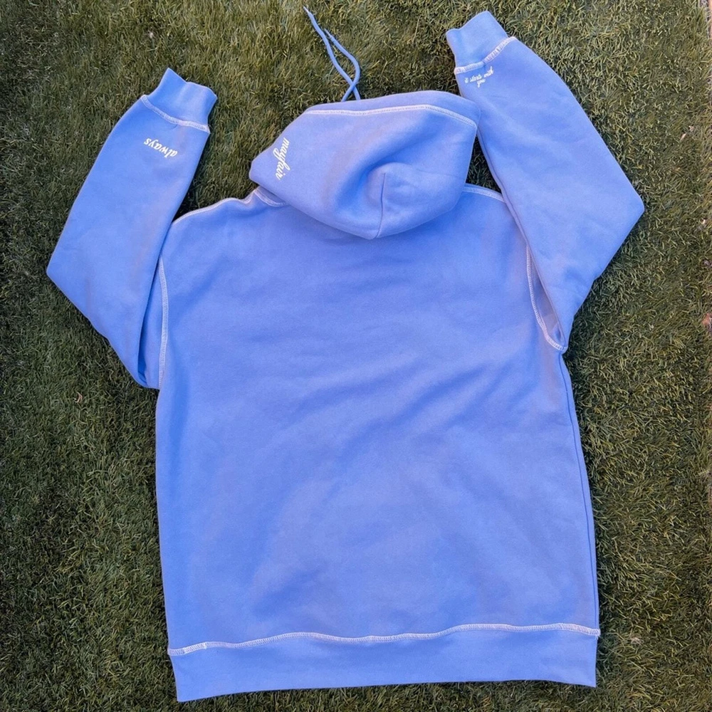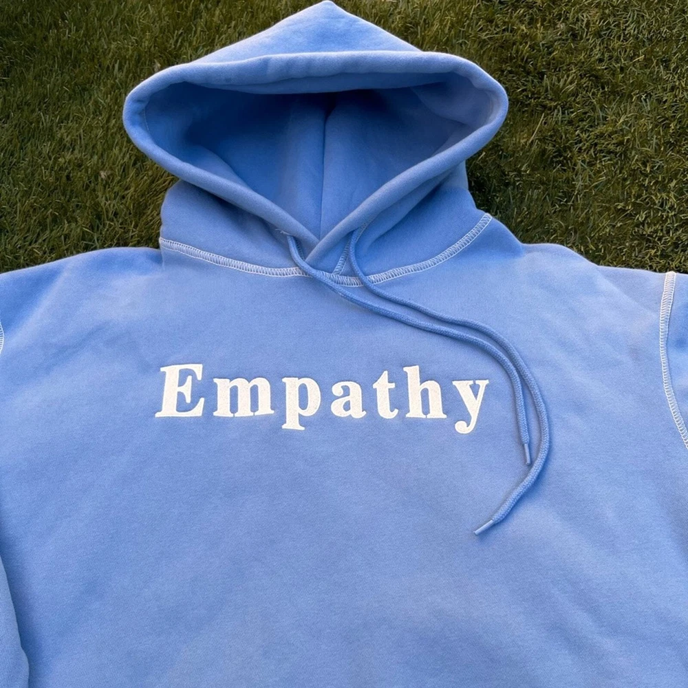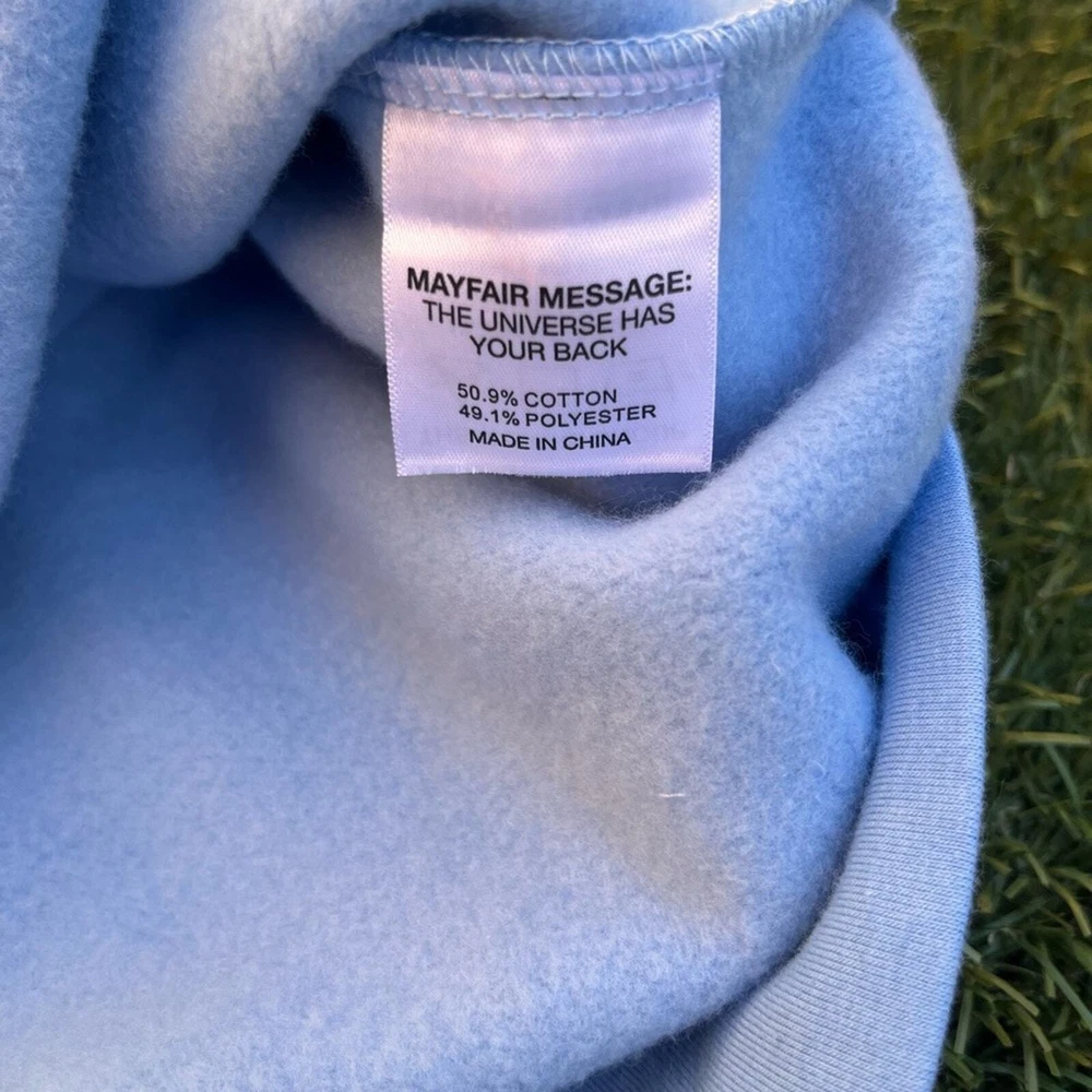 Pre-Owned pull over hoodie sweatshirt by Mayfair Group Style is the Empathy Always Hoodie Color is Baby Blue and white Size extra small, oversized unisex fit Measurements: Pit to Pit 25 inches Length 27.5 inches Arm Length Inseam 20 inches Light blue baby blue Vintage Y2K Hiphop Streetwear vibes, from this on tread unisex brand that supports mental health and self care. Universal positive messaging, with on-tread minimalist styling. Thick and warm, this mid weight sweatshirt is perfect for lazy days in the winter, or a cozy school outfit with its oversized relaxed fit.