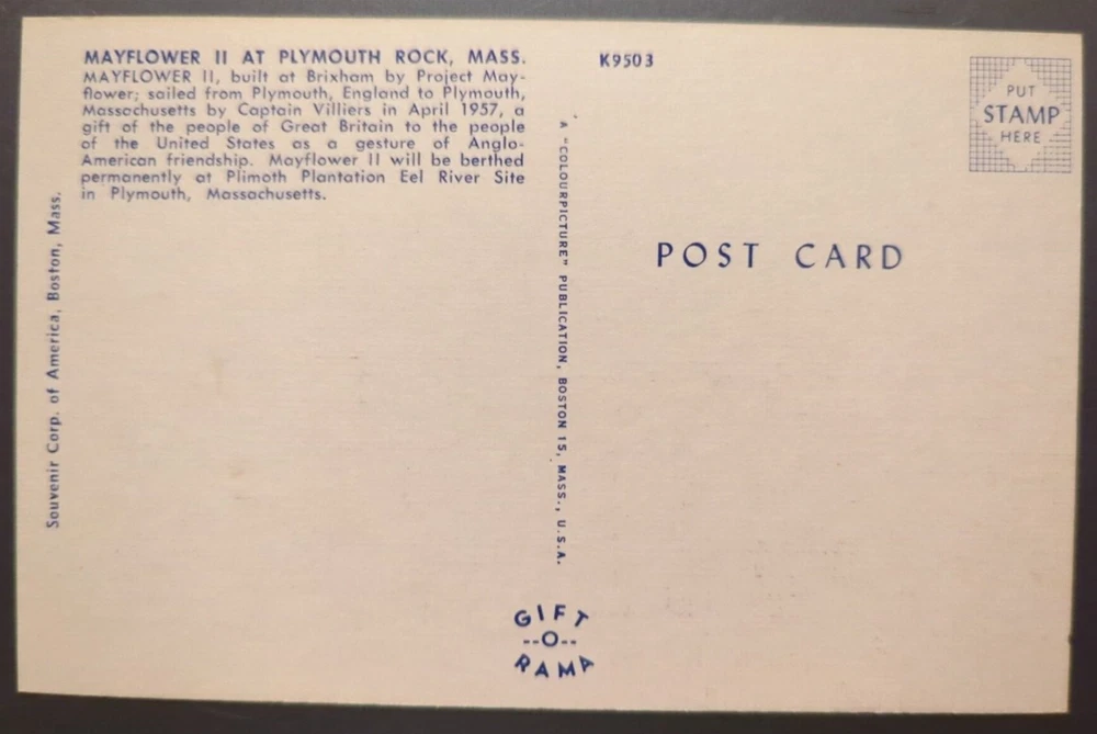 Mayflower II At Plymouth Rock Massachusetts VTG Souvenir Linen Postcard. There may be wear on the edges or a bent or torn corner, staining or writing on the card, creasing, or the card may have a cancellation mark. Most of the postcards I sell are 50 to 100+ years old and will never be perfect. Please examine the photos carefully for condition information. All postcards with a value of less than $20 are shipped with a 2 mm postcard sleeve and a piece of heavyweight cardstock on either side, taped closed with masking tape and placed in a heavy cardboard mailer. Postcards with a value of more than $20 are sent ground advantage in a 2 mm postcard sleeve, sandwiched between cardboard and shipped in a padded polybag.