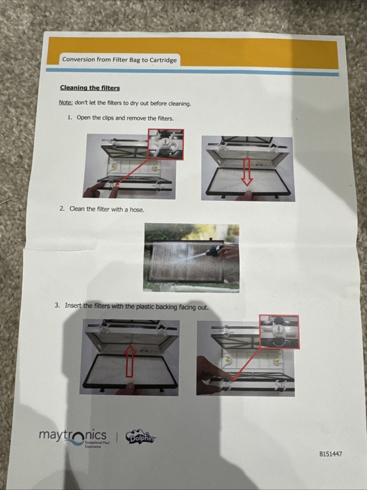 Please note, do to high volume of transactions, we observe the right to change and/or alter description pricing shipping at any time with or without notice. Final amount is evaluated based on bids received. Any and all low offers and/or bids will be cancelled at our descretion. Thank you for your understanding, Happy Bidding.Please note, do to high volume of transactions, we observe the right to change and/or alter description pricing shipping at any time with or without notice. Final amount is evaluated based on bids received. Any and all low offers and/or bids will be cancelled at our descretion. Thank you for your understanding, Happy Bidding. The Maytronics Dolphin Cartridge Filter and Bottom Lid with Screen (9991424-ASSY) is a set of 6 pool cleaning tools suitable for swimming pools. This filter cartridge set includes a filter cartridge, bottom screen with mesh, and full instructions for use. Manufactured by Maytronics, this product is specifically designed for pool cleaners, offering a reliable and effective solution for keeping swimming pools clean and maintained. With its high-quality materials and precise fit, this filter cartridge set ensures optimal performance and efficiency in pool cleaning tasks. What is pictured is what you will receive.