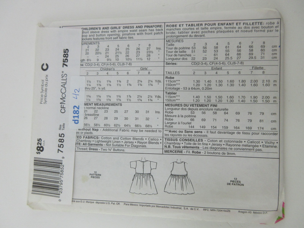 McCall's 7585 sewing pattern for children's dress and apron in sizes 4, 5, and 6. New and uncut with factory-folded tissue and instructions included. Envelope may have minor wear from storage. Please see photos.