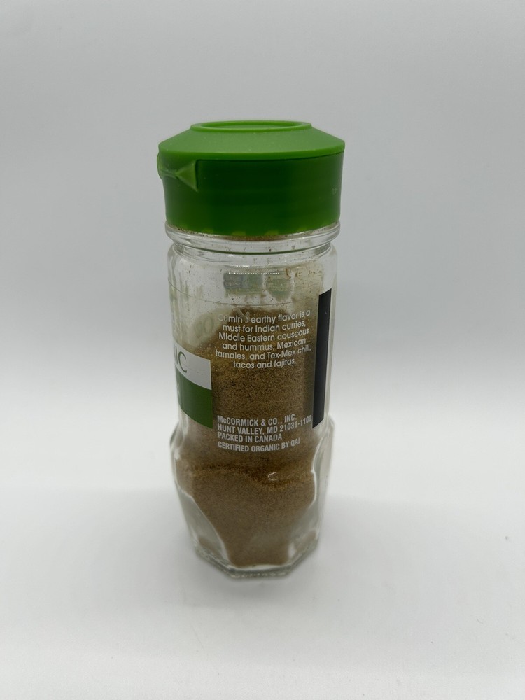 McCormick Gormet Ground Organic Ground Cumin Green Glass Spice 1.5 Oz. Bottle. This is an open, used, and/or expired item. The contents should be replaced. This listing is for the bottle only. Please refer to the pictures for the quality and condition of this item. 0/29/1/23