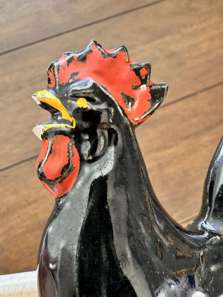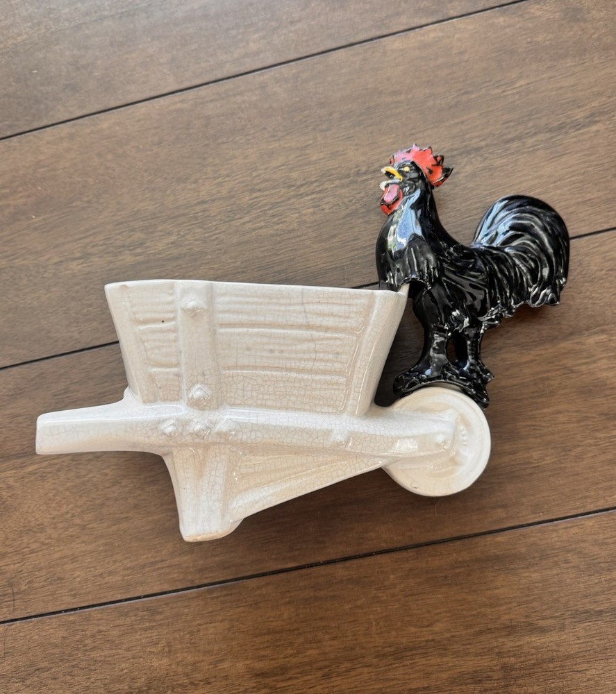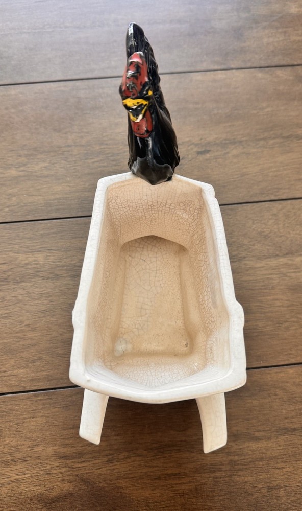 Paint is excellent. ***Please note*** The rooster beak is chipped and a small Knick on the corner of the wheelbarrow - see pictures for details. If the planter is positioned to one side the beak blemishes is unnoticeable. The McCoy Pottery Cold Painted Black Red Rooster On Wheelbarrow Planter is a vintage farmhouse style piece made of clay in the United States. The planter features a rooster design in black, red, and white colors, with an art pottery production style and technique. The item measures 10 inches in length, 7 inches in height, and 3 1/2 inches in width, making it a unique and charming addition to any decorative pottery collection.