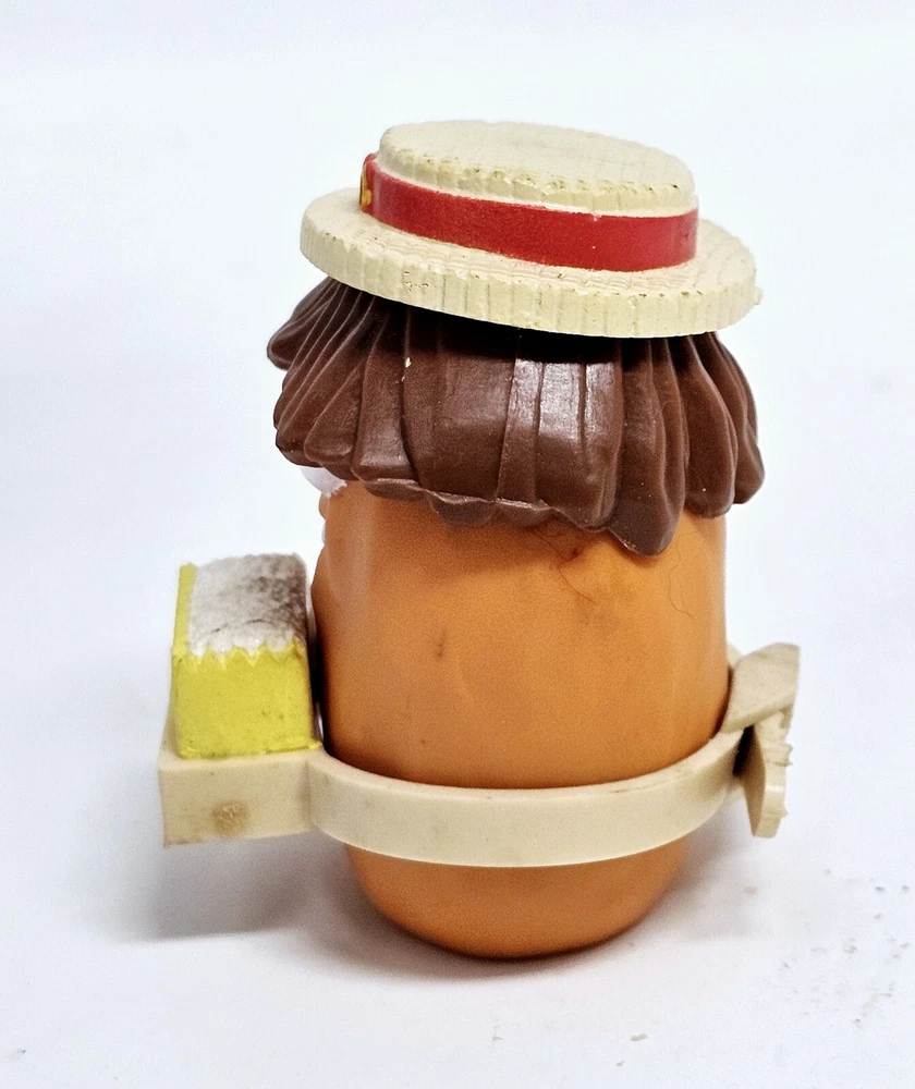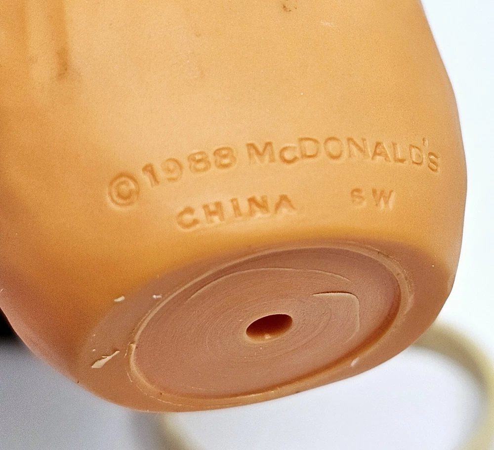 This is a vintage McDonald's Chicken McNugget Buddies toy from 1988, featuring the character Corny who is a popcorn vendor. This collectible item was part of a Happy Meal promotion in China and is a sought-after piece for fans of McDonald's memorabilia and Fast Food & Cereal Premiums.