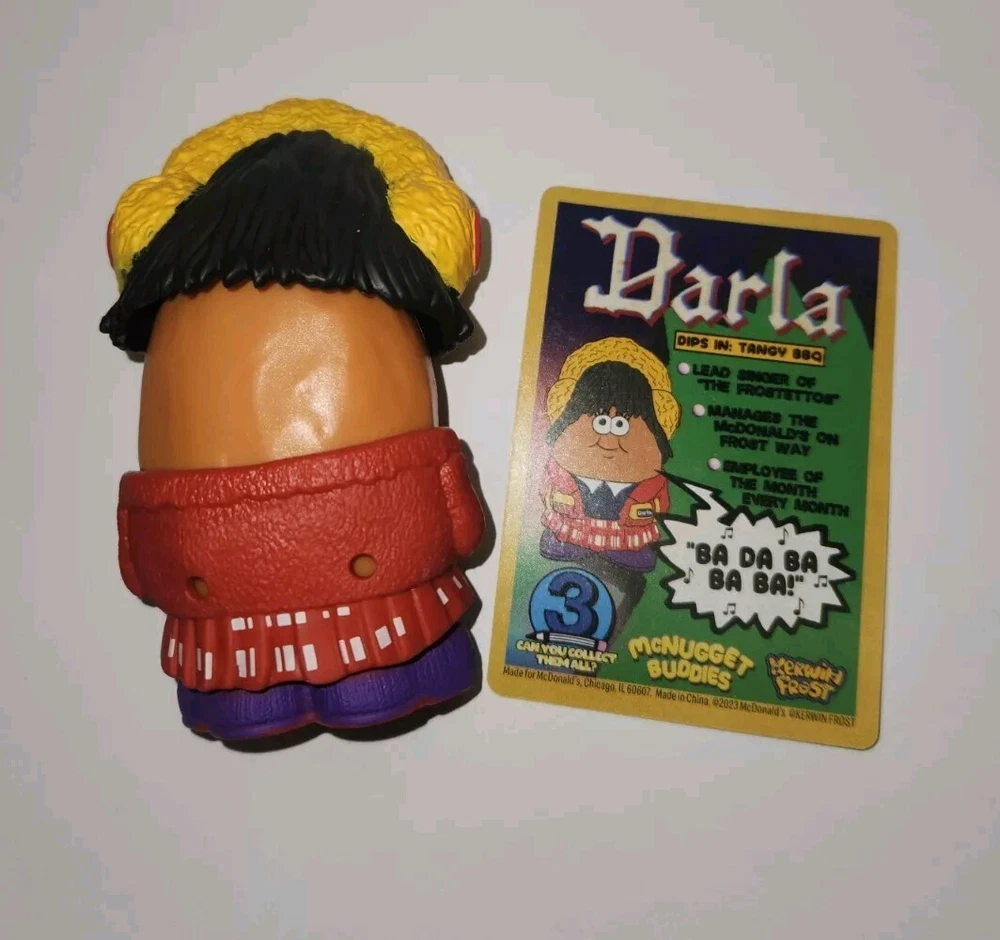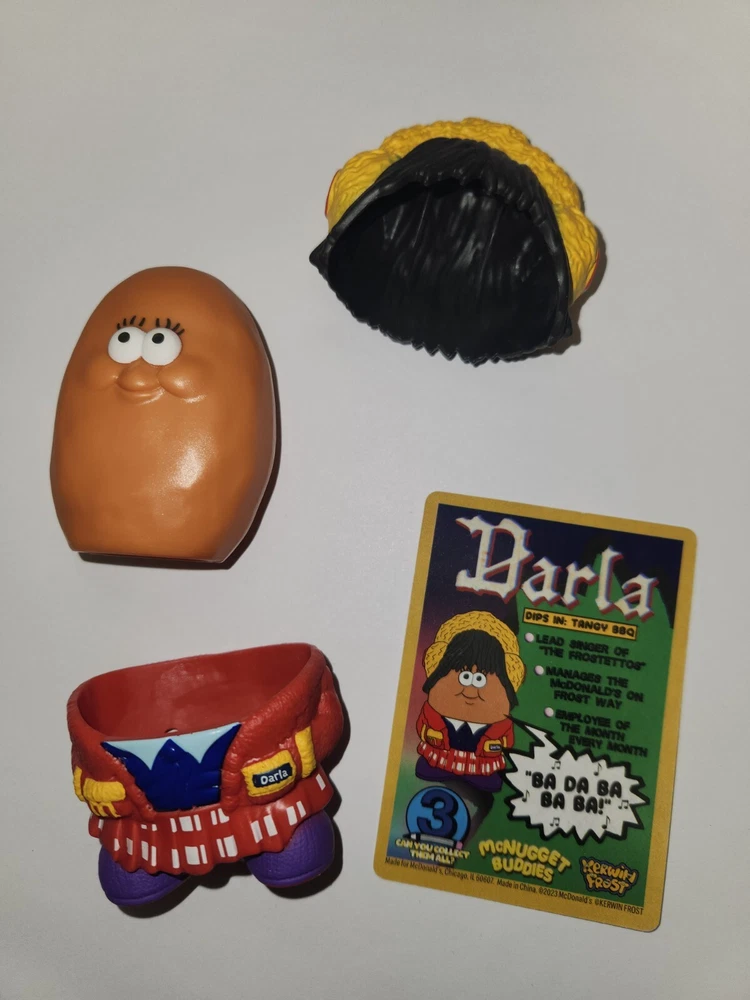 The product is a McDonald's Darla McNugget Buddies Adult Happy Meal toy from 2023, manufactured in China. This toy belongs to the Character Family of McNuggets and comes with a card. It is a collectible item that was likely part of a promotional campaign at McDonald's. The Darla McNugget Buddy toy is designed to appeal to adults who may have nostalgia for the McDonald's brand and its iconic McNuggets.