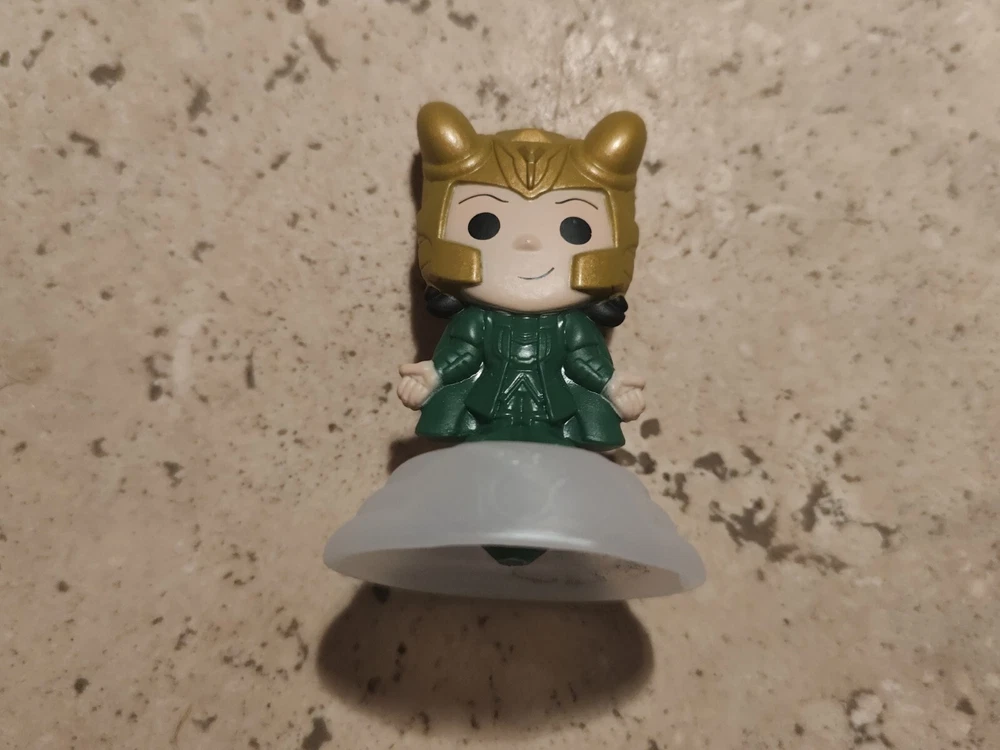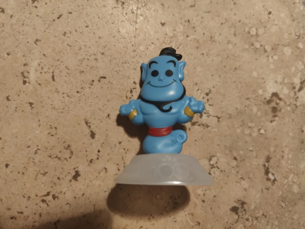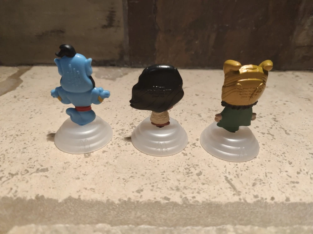 The McDonald's Disney's 100 Celebration Happy Meal features toys inspired by popular Disney characters Aladdin, Loki, and Moana. All three figures are preowned in average condition. Each stand approximately 2.5" more or less