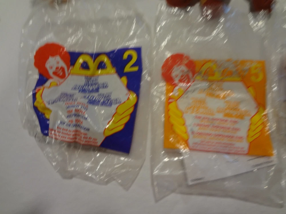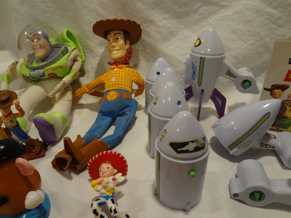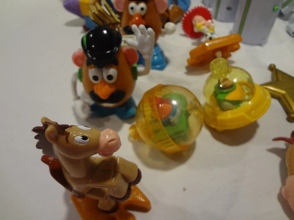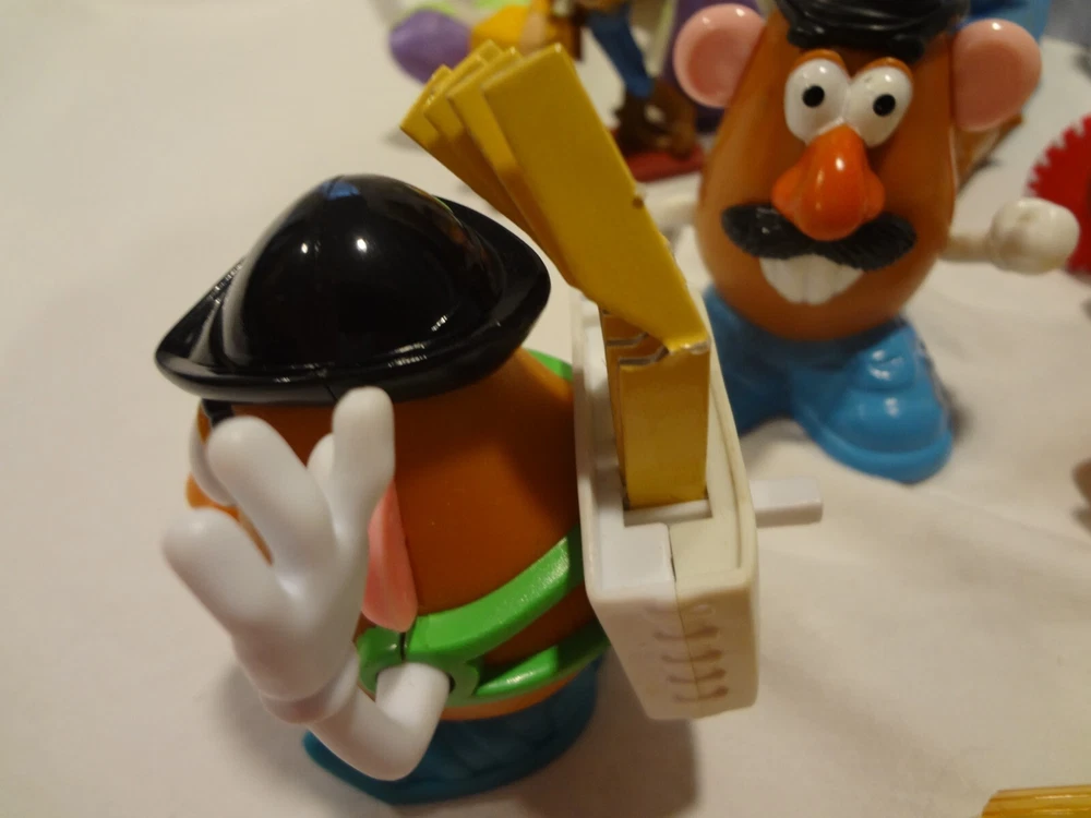 McDonalds Happy Meal Toy Story Toys Figures Lot . One of the books is still wrapped in plastic. The other book is empty. Mr. Potato with the french fries and without the french fries on his back swings his arm when you push the button on the back. both wind-up dogs work