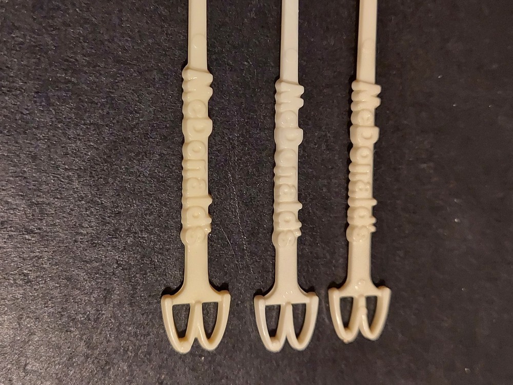 The product is a set of three vintage McDonald's coffee stirrer spoons, featuring a white color and a restaurant and fast food theme. These original collectibles were manufactured in the United States and bear the iconic McDonald's brand. Perfect for advertising or adding a touch of nostalgia to a collection, these spoons provide a unique and classic touch to any memorabilia assortment. this is a lot of 3 1 Spoon 1 flat Paddle and 1 flat Spoon.