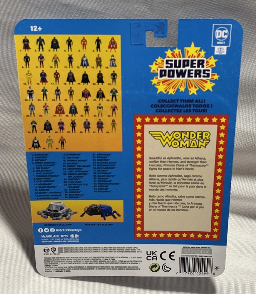 DESCRIPTION: WONDER WOMAN (SUPER POWERS) - 40TH ANNIVERSARY Brand: DC Super Powers Genre: Comics Product Type: Action Figure Series: IN STOCK Now As Themyscira’s emissary to Man’s World, Diana has made it her duty to lead by example, even if the differences between her birthplace and new home sometimes present hurdles for her to jump. She has come to represent the possibility and potential of life without war, hate or violence, and she is a beacon of hope to all who find themselves in need. She stands as an equal among the most powerful Super Heroes, with a sense of purpose to protect the world from injustice in all forms. Product Features: Continuing the legacy of the DC Super Powers line of the 80s, comes a brand new batch of your favorite heroes and villains in the classic nostalgia series we all love Classic 4″ scale Super Powers Figures with 5 points of Articulation Wonder Woman is featured in her classic DC Rebirth look Comes packaged in iconic Super Powers blister card packaging with updated artwork and logos reflecting your favorite characters Collect all McFarlane Toys Super Powers Figures *CONDITION!* Figure Grade: MINT Package Grade: NEAR MINT! Return policy After receiving the item, contact seller within Refund will be given as Return shipping 30 days Money back or item exchange (buyer's choice) Buyer pays return shipping Return policy details If EXCHANGE is the buyers choice, then shipping for exchanged item is BUYERS responsibility! Payment details Payment method Preferred / Accepted PayPal Preferred Visa/MasterCard, Amex, Discover Accepted Seller's payment instructions INSURANCE is provided for DOMESTIC UPS GROUND and USPS INTL PRIORITY MAIL ONLY! ALL other options are the choice of the buyer based on THEIR decision since multiple shipping options are offered! ALL INTL 1ST CLASS packages are UNINSURABLE items and we will NOT be held responsible for LOST or DAMAGED items! We DO NOT pay Intl CUSTOMS FEES, nor will we ADJUST shipping labels to avoid your countries fees! BUYER agrees to these terms by finishing the checkout process and paying for their Msde!