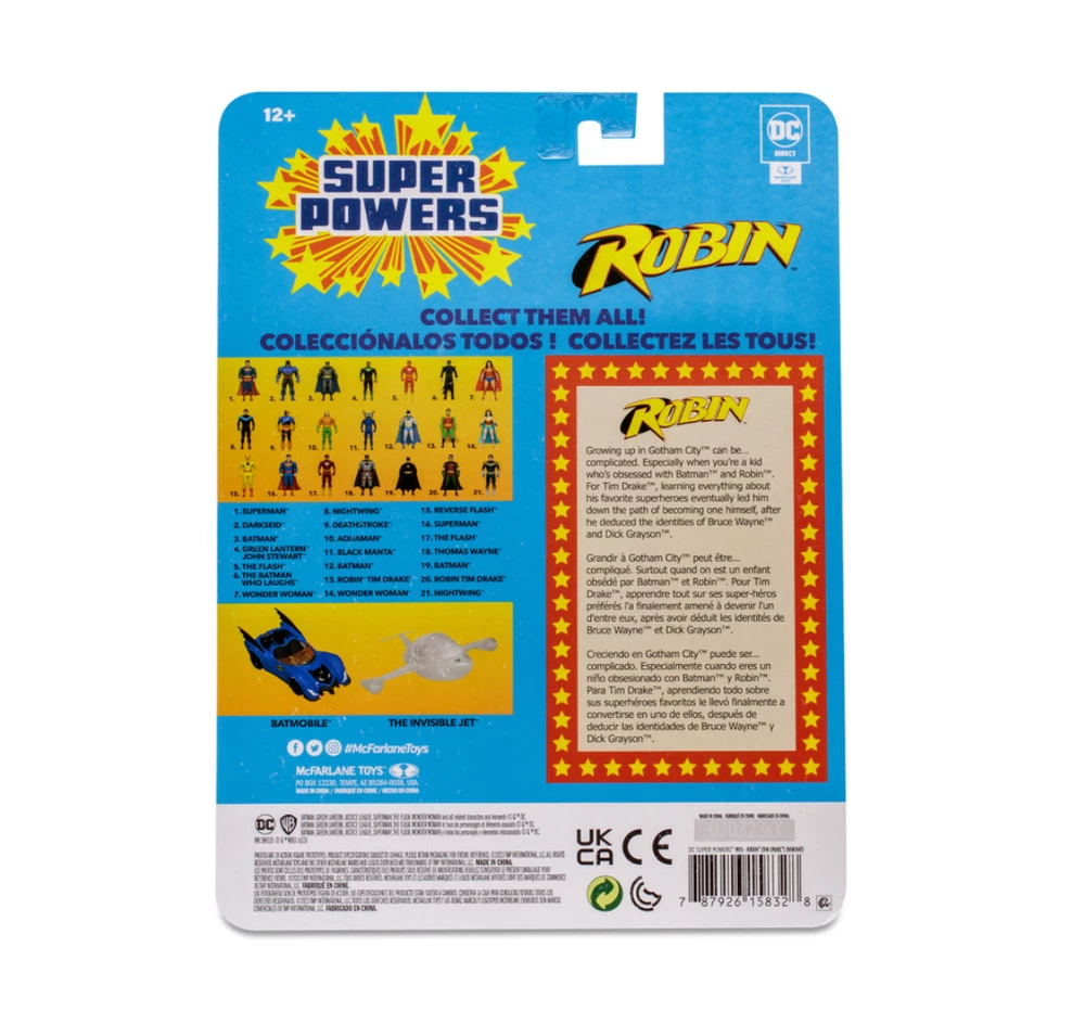 Brand New and Un-Opened Item. Box and Figure in Excellent condition. Ready for shipment on purchase. Item will be packaged with great care before shipping. Item Details: TIM DRAKE possesses detective skills comparable to those of his mentor BATMAN, though his heart may be his greatest weapon. Continuing the legacy of the beloved DC SUPER POWERS line comes a brand new batch of your favorite heroes and villains. Classic 4.5" scale DC SUPER POWERS figures with articulation. ROBIN is showcased in DC SUPER POWERS themed blister card packaging. Collect all McFARLANE TOYS DC SUPER POWERS figures and vehicles.