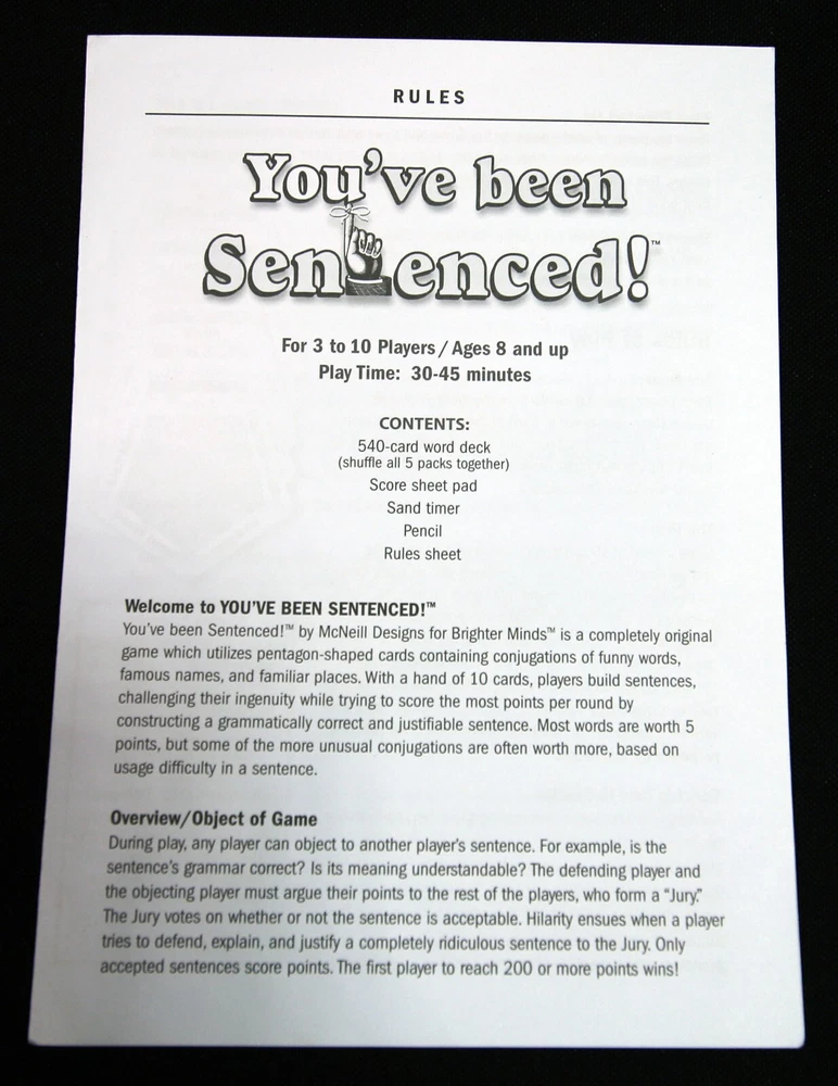 This complete game, from McNeill Designs titled "You've Been Sentenced," is a fun and challenging strategy game for families, with a recommended age range of 8+. The goal of the game is to create sentences and then have all the other players judge them. The defending player must justify their sentence. There will, quite possibly, be sentences that have never been uttered before, in history, and trying to justify them is what the game is all about. The game includes a deck of cards, a score pad, and instructions to make it easy to start playing right away. The game, manufactured in China, has won the 2007 Creative Child Magazine Seal of Excellence award. This game is a great addition to any family game night and is sure to provide hours of entertainment. Each item we ship is carefully packaged to prevent any damage and is shipped immediately with tracking.