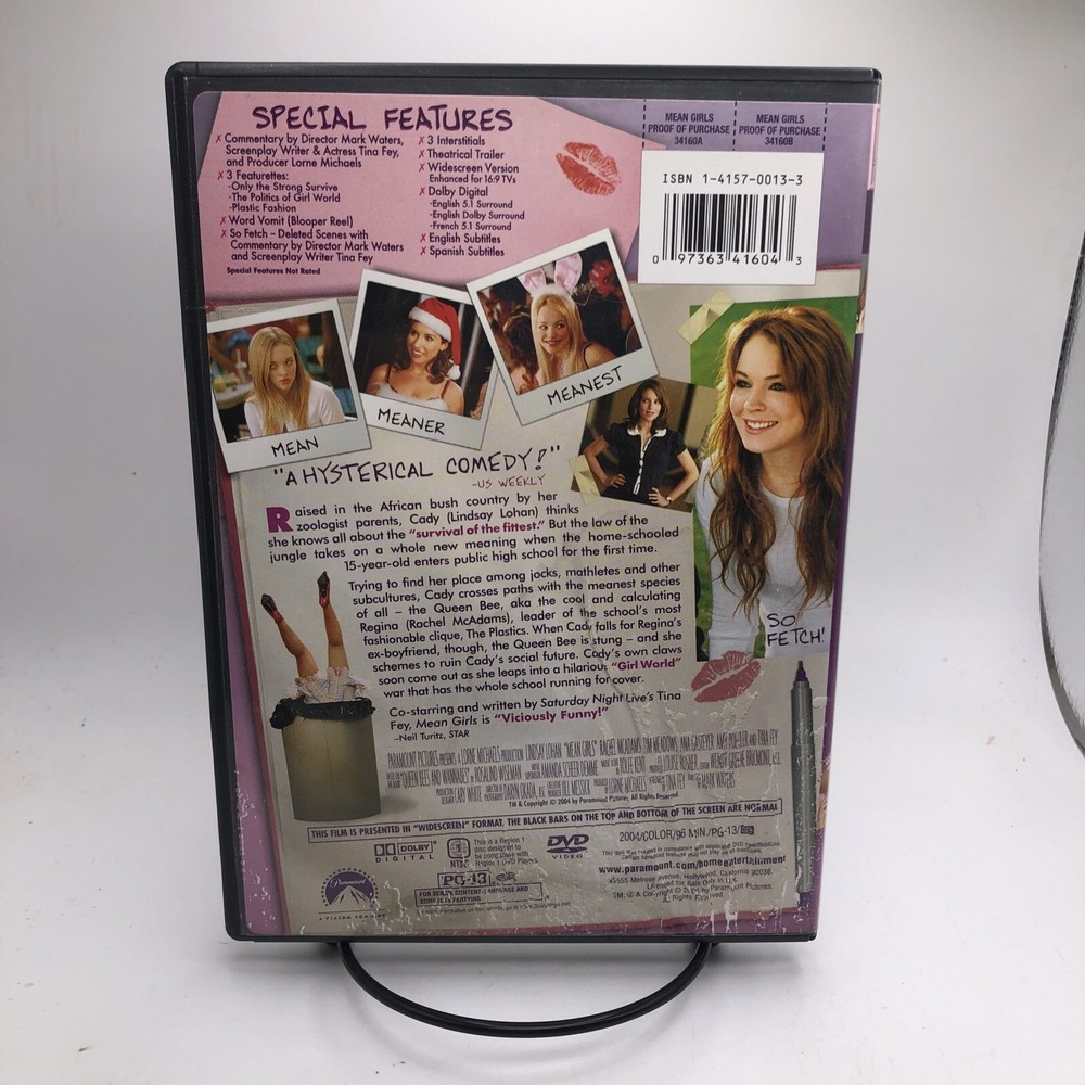 Edition: Widescreen Special Collector's Edition Features: Widescreen Rating: PG-13 Type: Movie Genre: Comedy Movie/TV Title: Mean Girls Language: English Region Code: DVD: 1 (US, Canada...) Case Type: Tall/DVD Case Country/Region of Manufacture: United States Director: Mark Waters Format: DVD gtin13: 0097363416043 Actor: Rachel McAdams, Lindsay Lohan, Tina Fey Seller Notes: “Please see photos. All USED Movies will have some minor scratches and blemishes on cases.” Release Year: 2004 UPC: 0097363416043