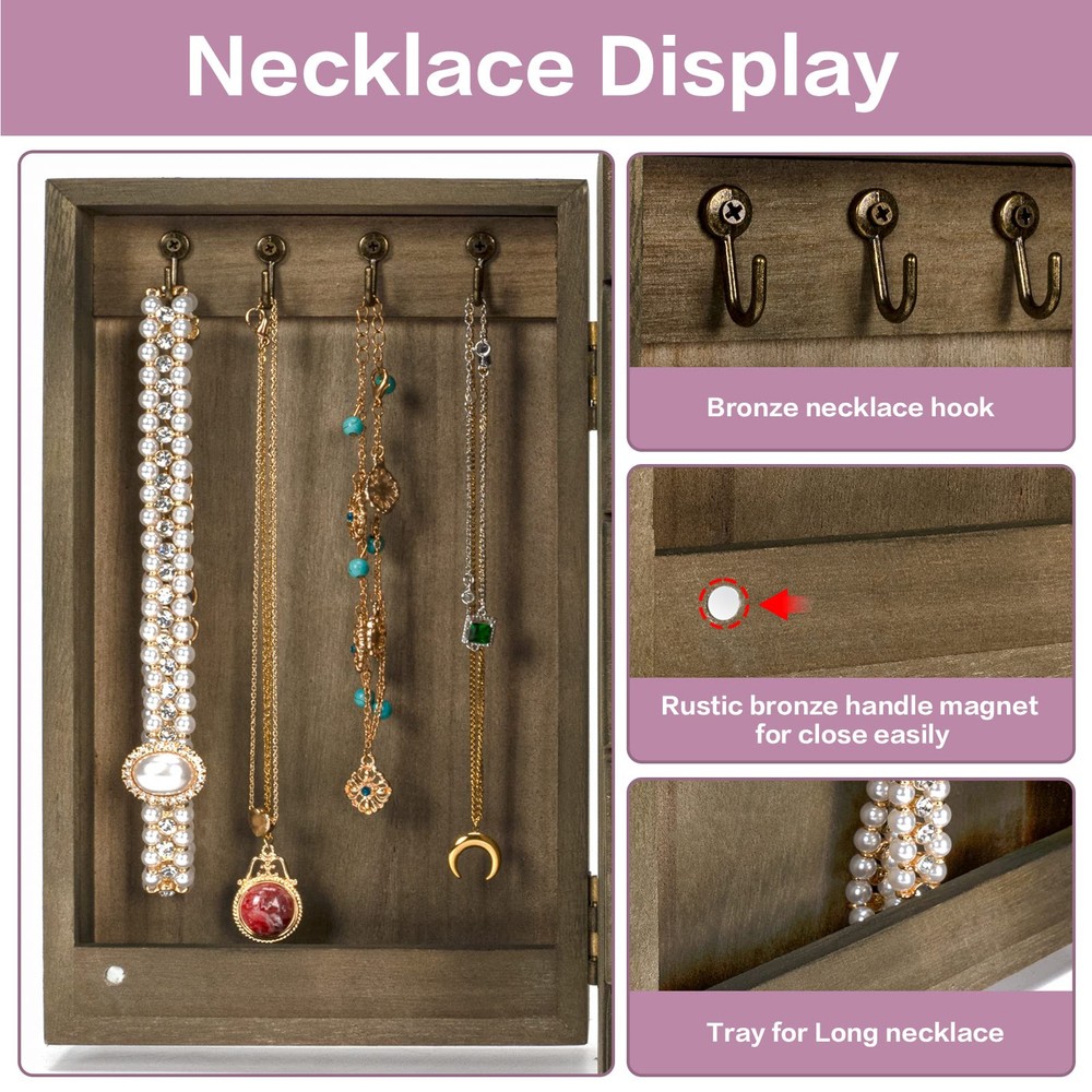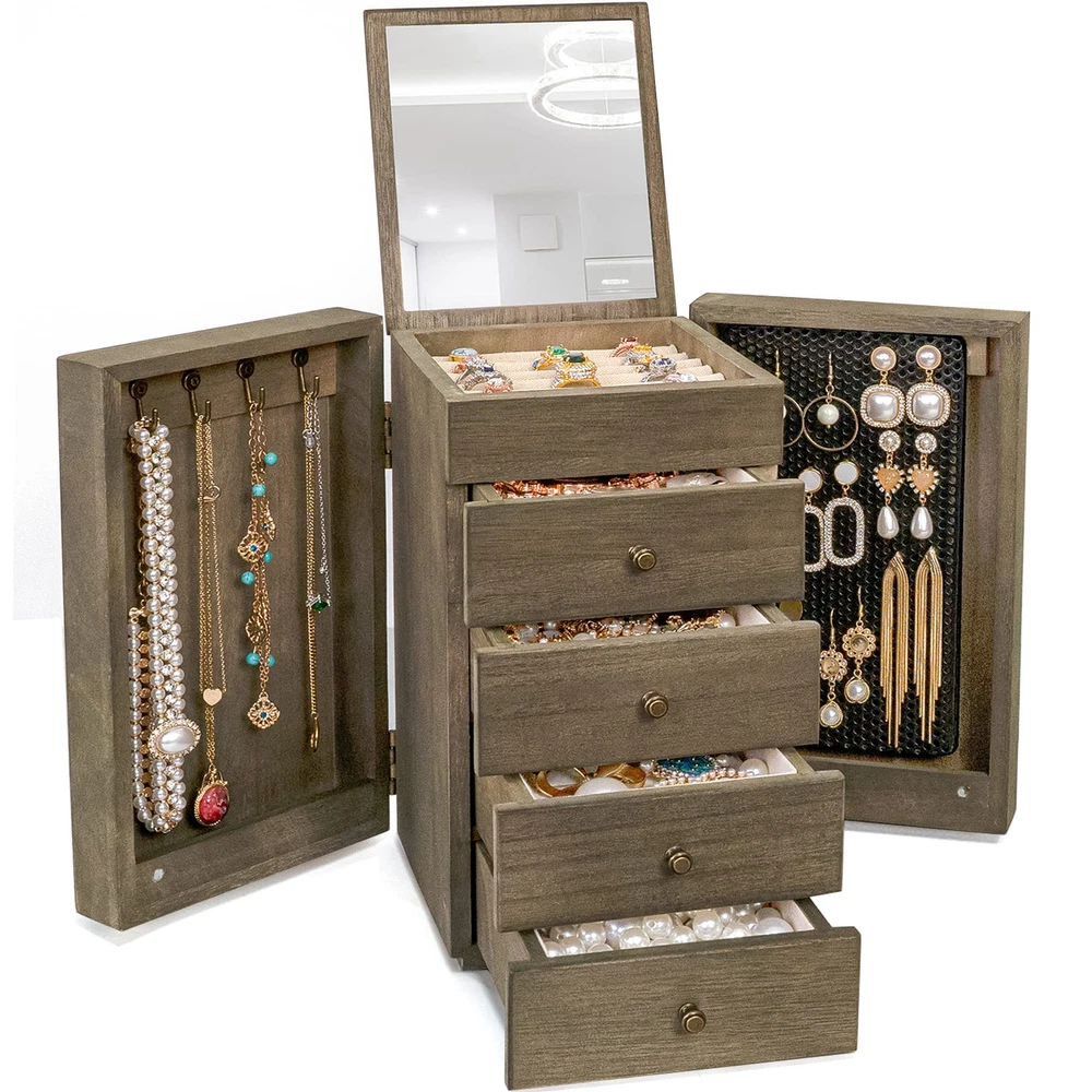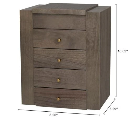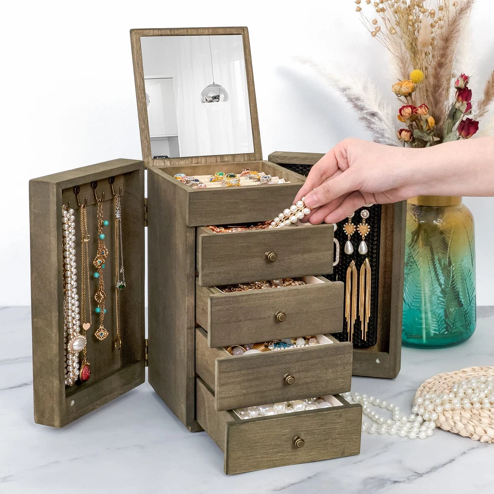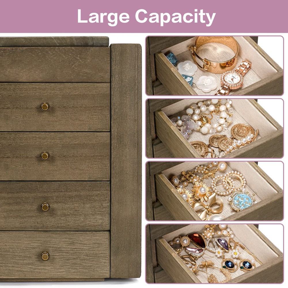 ❤Elegant Jewelry Box: Is your growing jewelry collection cluttering up on your dresser? The jewelry box designed with 5 tiers and 2 side doors. When it close, it will not take up much space, when it open, you will be surprised by its capacity, it is a pretty practical and charming addition to your home. ❤Large Capacity: The top layer has a built-in mirror and ring tray, 4 pull-out drawers keep your jewelry away from getting messed up, easily store different sizes of jewelry, even necklaces, bangles, and big earrings like hooped earrings. 2 side doors for hanging chunky necklaces and plenty pairs of earrings. ❤Natural Solid Wood: Made of rustic quality wood, sturdy and durable to stand heavy jewelry. Linen cloth-covered inside keeps your jewelry well against dust, scratches, damages. Metal delicate handle highlights retro beauty. The large wooden jewelry box can last for years. ❤Ideal Gift for Loved One: Whoever your Loved one's Mom, Wife, Daughter, or Girlfriend, the jewelry box is even also perfect as a housewarming present, and an anniversary gift, we can be sure this will be the most practical and memorable gift they have ever received. ❤ SATISFACTION SERVICE: The jewelry organizer box size: 8.26″L x 6.29″W x 10.62″H. Like it or get money back, we are committed to the highest levels of quality and excellence and stand behind every product we make, we’ll happily resolve the matter.