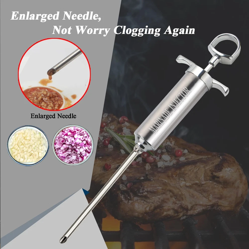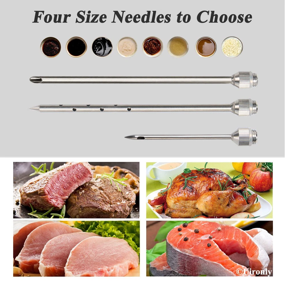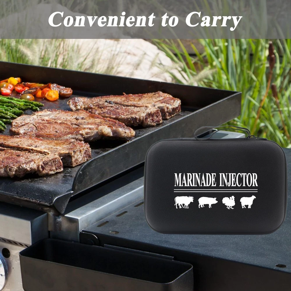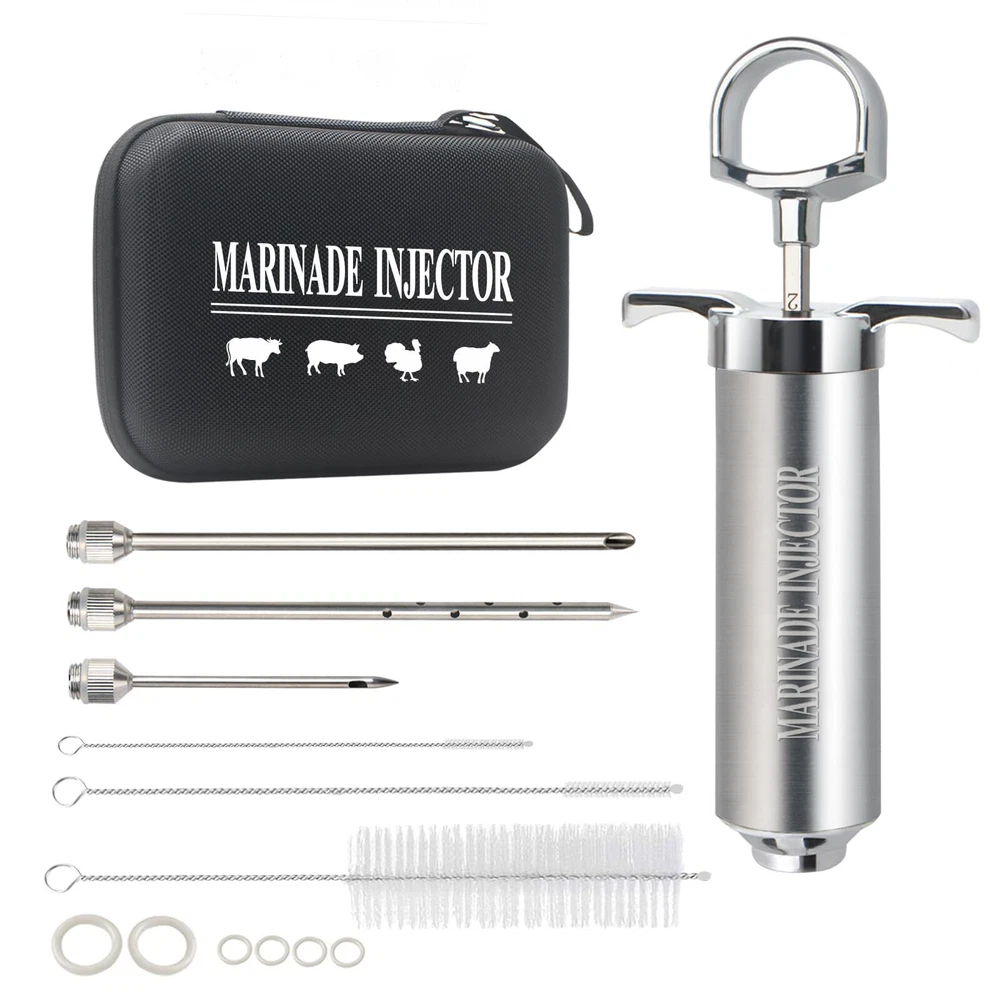 Robust Carrying Case – For protecting all your injector needles and all the cleaning brushes. Will help you store the parts. Complete marinade injector kit for the professional competition BBQ, home chef, foodie, grill, family party, bonfire party. Comfortable Design -- Enlarged plunger handle surface offers a comfortable grip and provide air tight suction and smooth release when you inject the marinade/seasoning. Ergonomic threaded design keep the flavor injector NO leak and easy to assemble or dismantle. Professional Flavor Delicious -- Includes 3 Professional marinade needles Syringes. 6 inch needle with 12 small holes for liquids; 6 inch angle-cut needle for injecting marinades with finely-minced puree, chunky or grated; 3 inch needle for precision applications. Juicy Tender & Yummy For Every Bite – The Food injector is solidly built to last to intensify flavors of Thanksgiving Christmas turkey, beef brisket, pork, lamb, chicken, goose, duck; inject jelly pudding into donuts, rum into strawberries, brine into home-cured meats; practical for kitchen tools, holidays, BBQ, smoker grill, family party, bonfire party! What You Will Get --1 travel case; 1 meat syringe; 3 meat needles; 3 cleaning bushes; 6 syringe silicone O-rings; 1 meat smoking guide; Timely and friendly customer service, you can us by your Amazon account if you have any issue about our BBQ injector