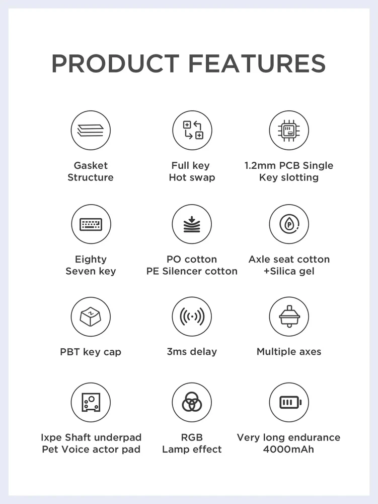 Model Number:Aula F87pro Mechanical keyboard: The Wolf Spider F87pro adopts a mechanical keyboard design, using mechanical switches to achieve key triggering. Mechanical keyboards usually have minimal keys and more obvious keyboard keys. Customizable RGB backlight: This keyboard needs to be equipped with customizable RGB backlight, which can choose different colors and effects according to the user's preferences to enhance the appearance and personalization of the keyboard. There are various keyboard shaft options, including stable gray wood shaft and agile flexible shaft V3, to meet different typing habits. Whether you are an e-sports expert or an office expert, you can find the most comfortable typing feeling Wolf Spider F87 adopts Gasket structure, which enhances the stability of the mechanical keyboard and makes the keys rebound more quickly. Full-key hot-swappable axis base, full-key no rollback, 4000mAh long-life battery We use open-molded silicone bottom pads and sound-absorbing bottom cotton, so whether you are working in the dead of night or during exciting gaming moments, you will not disturb others and enjoy concentration and efficiency. Gasket structure, PCB Single key slotting, 3ms Put off 5 layers fill, 4000mAh 87 keys to Streamline layout less space for code words ore comfortable, more desk space Full key conflict free Five layersof fill silencing Fill the gap between PCB, positioningboard and shaft body, effectively offset the cavitysound of shaft body knocking positioningboard, providing a solid feel Gasket Structure with 5-layer noise reduction:keyboard with a PC plate and 5-layers premium silicone pads and noise reduction cotton to reduce 95% hollow noise,abosord typing noise,and enhance the unique soft and comfortable Full key shaftSeat hot swap Free to replace the shaft body, change it at willcustomize a keyboard that suits your own habits About 16 million colors, 16 no-drive lighting modes With the drive, it can achieve 10 kinds of musicrhythm RGB lighting effects Two-colorPBT key cap Long-term use of the surface is not smooth, bringcomfortable operating experience RGB flank lights New light strips on the left and right sides of the keyboard define dynamic or fixed light effects in a variety of colors to create a cool game atmosphere Macro driver setup Can achieve custom key area, RGB music rhythm light effect setting free programminggame shortcut key custom AULA F87pro Specification: Model:F87pro Type: Mechanical keyboard Number of keys: 87 keys Connection method: wired & 2.4G USB& Bluetooth With or without hand support: No Product size: 36.59 * 13.9 * 4.11cm Backlight: RGB Customized Battery:4000 mhA Keycap height:OEM profile Keycap meterial:PBT Customized Design Makes F87pro the Perfect Chioce ①With two-stage adjustable foot support design,you can autonomously adjust the bottom with non-slip rubber pads at the bottom of theinput angle of your preference, bringing a more stable use experience. ②Side switching bottons and receiver storage slot are located above the keyboard. Side switching does not require flipping.which is simple and elegant. ③OEM profile PBT meterial double shot keycaps,the surface will not be shiny after long-term use, bringing a comfortable operating experience. ④equipped with built-in 4000mhA capacity lithium battery, which can be charging through the Type-C cable while using in wired mode. When fully charged, it lasts 53 hours with the lights on, and about 400 hours with the light off.