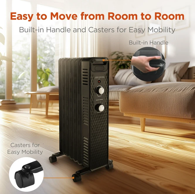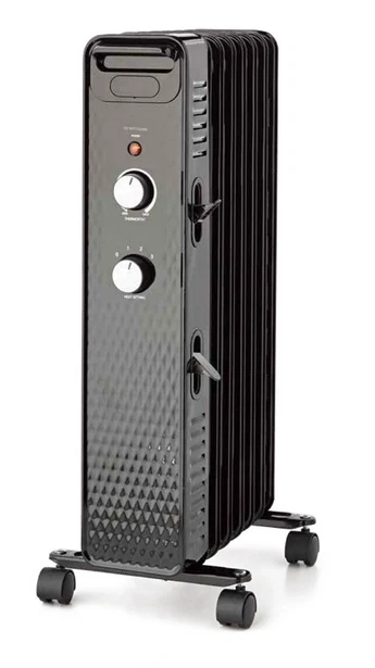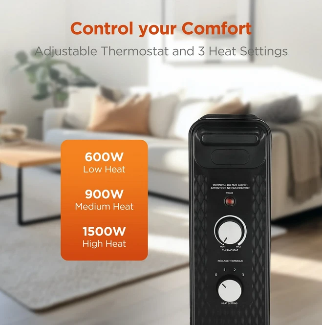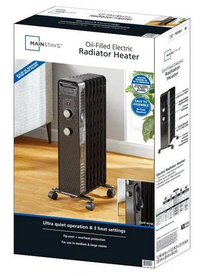 About this item Product details The New Mainstays Mechanical Oil Filled Electric Radiator Space Heater keeps you warm when the temperatures drop. It comes with four caster wheels for easy mobility, so you can move the heater from room-to-room. The heater is easy to use and features two control knobs - one for the thermostat, and one for the heat setting. With three heat settings (600, 900, and 1500 watts), you can maintain the perfect level of warmth. The space heater provides you with a comfortable, whole room heat without the noise of a fan. It's the perfect heater for day-to-day use while you work from home, practice your morning yoga, or relax in the living room. With safety features like auto shut off and tip over protection, you can rest easy and stay warm. Heat your home with the Mainstays Mechanical Oil Filled Electric Radiator Space Heater. Mainstays Mechanical Oil Filled Electric Radiator Space Heater, Black, New, WSH07O2ABB Three Heat Settings: Choose from 600W, 900W, or 1500W to perfectly match your heating requirements Easily Adjustable Temperature Settings: Two user-friendly knobs, one for temperature control and the other for selecting heat settings Enhanced Safety Features: Includes auto shut-off and tip-over protection for safe and worry-free operation Portable Design: Equipped with four caster wheels, allowing for effortless mobility and placement Power Indicator Light: Clearly shows when the heater is in operation Quiet Radiant Heat: Provides whole-room warmth without the disruptive humming noise typical of fan-based heaters Whole-Room Warmth: Efficiently heats entire rooms, ensuring consistent and comfortable warmth throughout Specifications Features Adjustable, Automatic Shutoff Brand Mainstays Power Type Corded Electric Recommended Location Indoor
