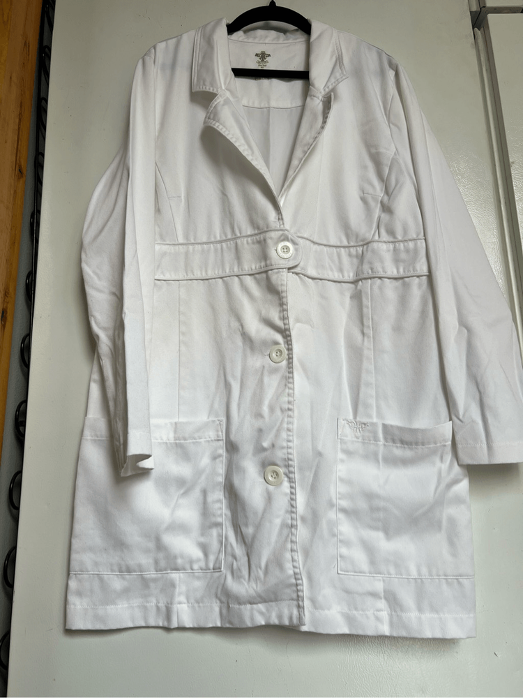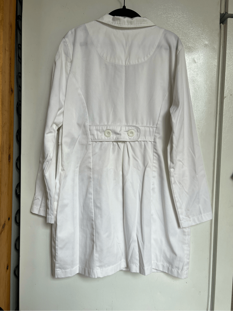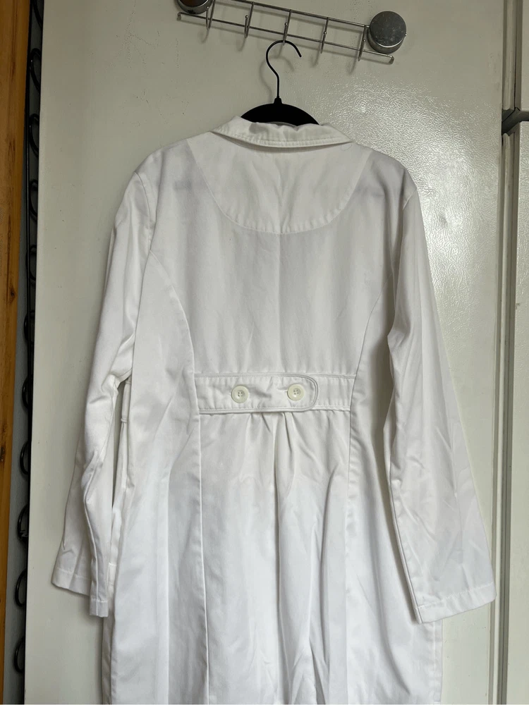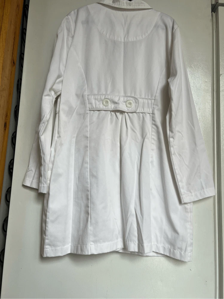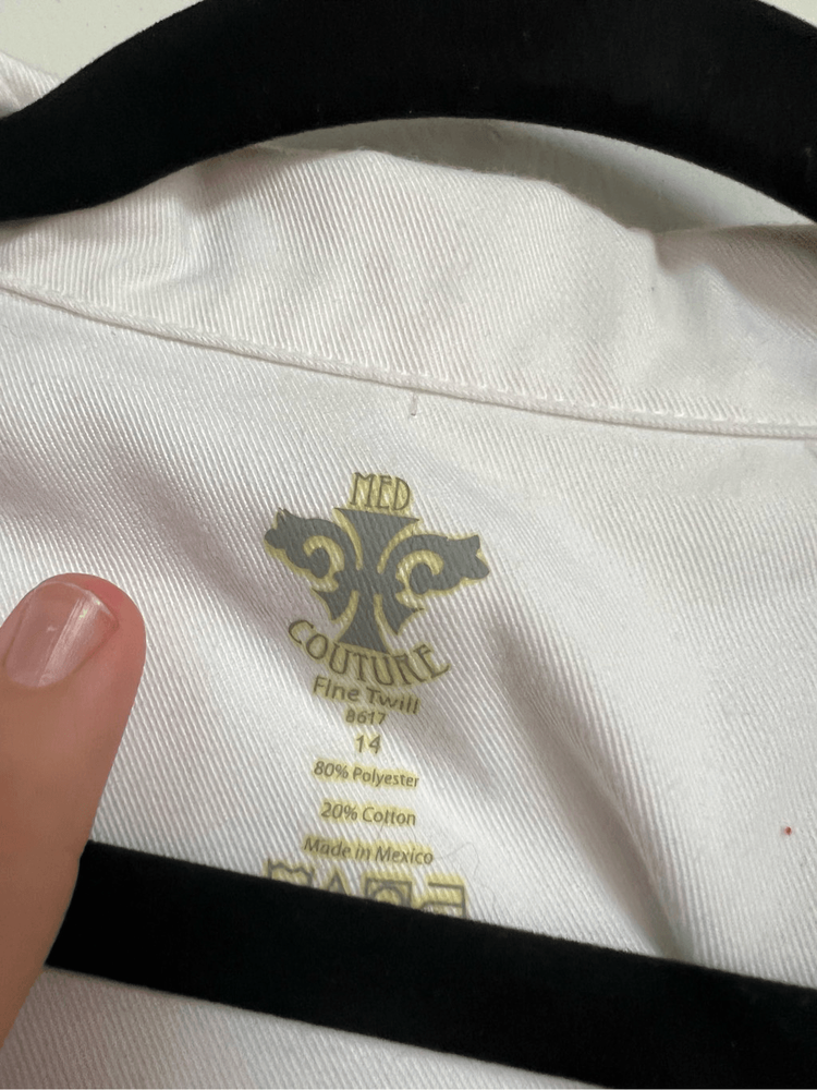 Med couture fine twill white lab coat. I did notice some small stains/marks. See photos I tried my best to get them to show up in photos but some don’t show up good. ~SIZE 14~ Item is preowned and may have small flaws that I missed Color may very in person as my phone changes the colors sometimes Offers always welcome Check out our other listings! All items are cross posted. Bin-mk18