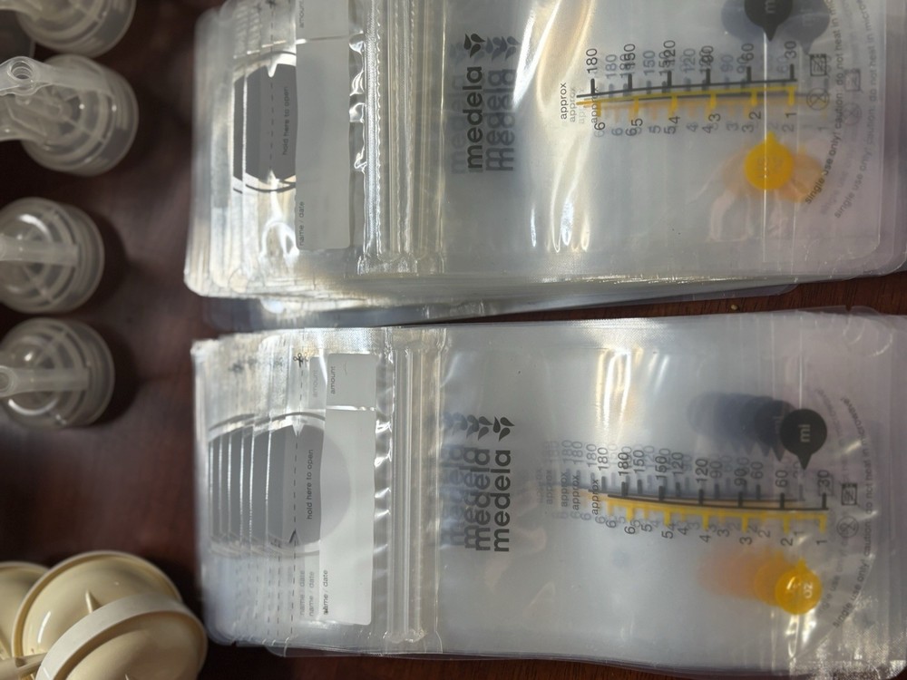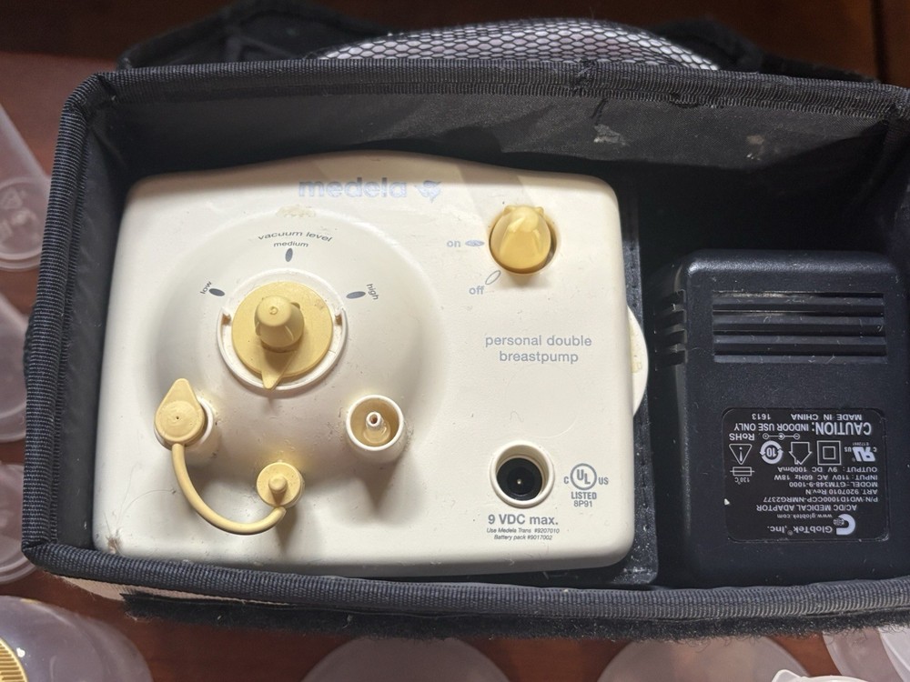 Feature : The Pump In Style Advanced Breastpump Starter Set is part of Medela's patented 2-Phase Expression technology pump family. Feature : Adjustable speed/vacuum control, Helps you choose your most comfortable setting. Medela's patented 2-Phase Expression® technology is Proven to get 18%* more milk when double pumping. One-touch let-down button: Lets you toggle between Stimulation and Expression phases for more efficient pumping sessions. INCLUDES: Power supply adapter AC 110v; Pump in Style tubing (3 NEW tube sets); PersonalFit breastshields (4) four medium (24 mm) & (4) four large (27mm); (8) connectors; 6 valves with 6 membranes, as well as an additional pack of membranes. 2-5 oz/150 mL breastmilk bottles w/lid & nipple: (11) storage containers w/ lids and two manual hand pumps. [Retail Price: $199.99 for just the pump machine] ***BONUS: Includes Over 100 Medela milk storage bags for freezing your liquid Gold!!***