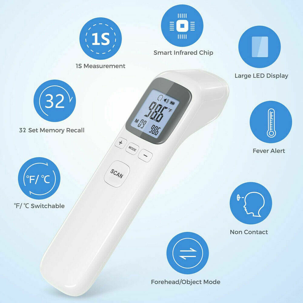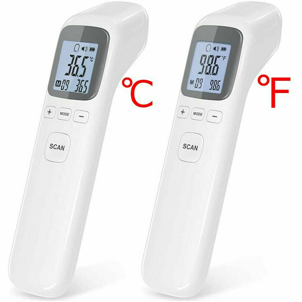 Product description Infrared Forehead Digital Thermometer, Temporal and Ear, Temperature Measurement for Adults Kids Infants and Baby, Accurate Instant Reading, Fever Alarm with Memory Function Product Features : Rapid temperature measurement: Simply point and activate, and within 1 second, results can be seen. 35 memory temperature readings Mute mode for readings for baby, infants, kids, and adults Temperature Alarm (default value is 100.4°F or 38°C) Measuring unit: Optional for Celsius ° / Fahrenheit ° Multi-function one key operation for body, object, forehead, and liquid temperature Automatic off function after 15 seconds Measuring Range: body mode: 93.2°F - 109.2°F or 34°C - 42.9°C Power by: 2 x AAA batteries (not included) Quick Start Guide °F/°C Switch: when the thermometer is on, press the "Mode" button about 2 seconds until F1 display , then press "+" / "-" button to switch between modes