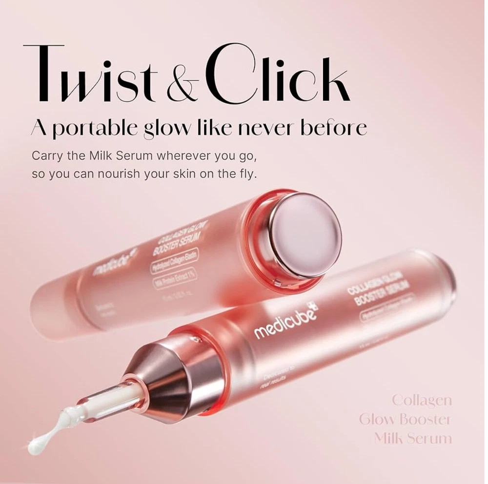 Medicube Collagen Glow Booster Milk Serum - Twist and Click - Radiance and Hydration with Niacinamide , Milk Protein Extract, Hydrolyzed Collagen . Illuminates and Frim Skin. Milky glazing formula : Featured on the TODAY SHOW, our top-rated serum combines advanced skincare technology with luxurious ingredients to enhance your natural radiance. This innovative serum boosts collagen production, hydrates deeply, and leaves your skin looking youthful and luminous. Elevate your skincare routine with the product everyone is talking about on national television. Innovative Twist & Click Packaging - Features a twist-push button mechanism and airless container to ensure the perfect amount of serum is dispensed and stays fresh with every use. Deep Hydration - Formulated with Niacinamide, Milk Protein Extract, and Hydrolyzed Collagen to deliver intense hydration, leaving your skin cushiony and supple. Premium Ingredients - Includes Ceramide NP to maintain the skin barrier, Adenosine for reducing fine lines, and Hexapeptide-2 for illuminating and evening out skin tone. Easy Application - Apply morning and night after cleansing and toning. Use one pump for the entire face and neck, gently massaging in for opti
