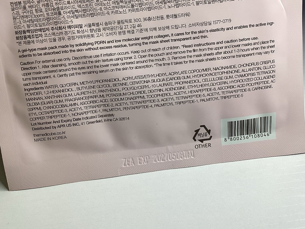 Brand: Medicube Body Area: Face Type: Mask Sheet Formulation: Gel Size: Regular Expiration Date: 5/8/2027 Color: Pink Active Ingredients: Hydrolyzed Collagen Country of Origin: South Korea (Republic of Korea)