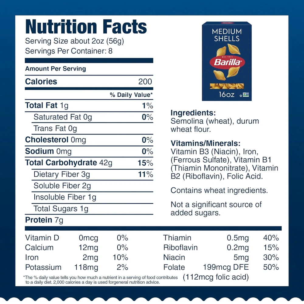 MEDIUM SHELLS PASTA: The graceful, concave shape of medium shells pasta, or Mezzo Conchiglie, resembles a seashell and is covered in ridges; Stock up with this pack of 12, 16-ounce boxes of medium shells pasta BARILLA PASTA: Made with durum wheat to deliver great taste and perfect "al dente" texture every time CREATE DELICIOUS PASTA MEALS: Great in pasta salads or macaroni & cheese, pair medium shells pasta with a dairy-based pasta sauce, tomato-based pasta sauce or meat sauces COOKS TO PERFECTION EVERY TIME: Perfect pasta in 8-9 minutes NON-GMO & KOSHER CERTIFIED PASTA: Barilla Medium Shells pasta is crafted with the highest quality Non-GMO ingredients and is kosher certified UNCOMPROMISING QUALITY, TRUSTED FOR GENERATIONS: A family-owned Italian company making pasta since 1877, Barilla brings you the best pasta made with care and the highest quality ingredients for perfect al dente pasta every time.