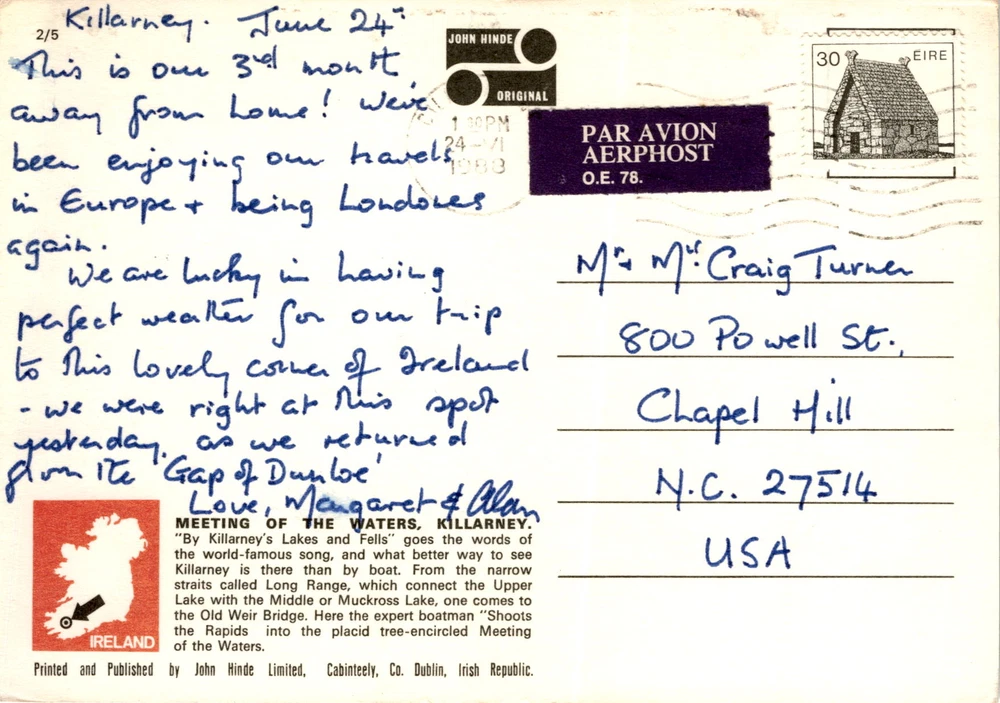 MAKE AN OFFER. THE MORE YOU BUY THE BETTER DEAL I WILL ACCEPT The postcard features a colorful photo of the Meeting of the Waters and Old Weir Bridge in Killarney, Ireland, taken by photographer John Hinde. The message on the postcard mentions it being the sender's third month away from home, traveling in Europe. They express their enjoyment of the trip and the perfect weather they've been lucky to have.