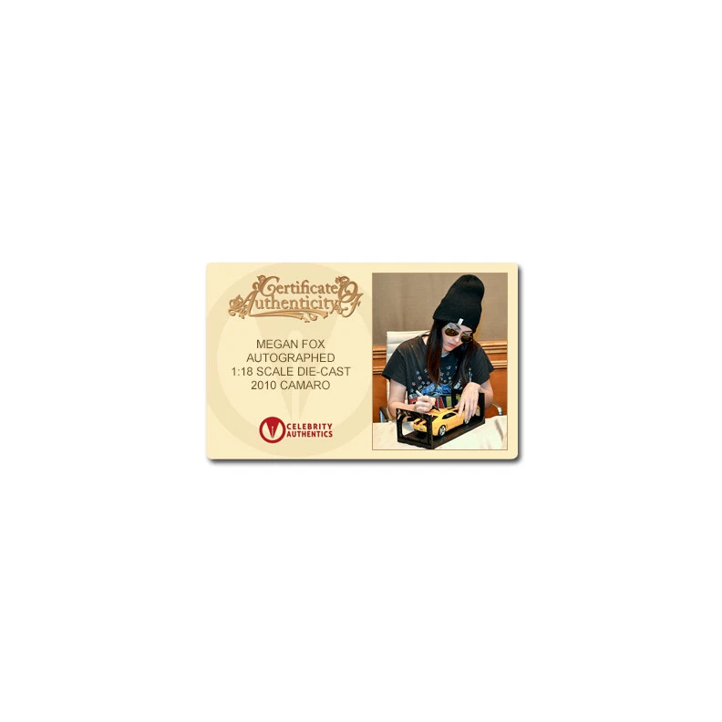 Powered by Frooition Contact Us Add To Favorites Receive Store Newsletter Megan Fox Autographed Transformers Bumblebee 2010 Camaro 1:18 Scale Die-Cast Car Megan Fox Autographed Transformers Bumblebee 2010 Camaro 1:18 Scale Die-Cast Car © Celebrity Authentics. All Rights Reserved. Item Description SPECIAL AUCTION NIGHT! eBay's shipping quotes are high and we do not profit on shipping. To save on shipping, we will combine winnings bids (if the items can ship together). We will refund any difference over $2. Good luck and happy bidding! This 2010 Chevrolet Camaro Concept Bumblebee Yellow from the hit "Transformers" Movie has been personally hand-signed by the stunning Megan Fox during her autograph signing with Celebrity Authentics. Produced by the "Maisto" Series, this 1:18 scale die-cast car features real rubber tires and a beautifully detailed interior and exterior, as well as an opening hood, trunk and doors! Made of die-cast with some plastic parts, this car measures approximately L-10, W-3.5, H-4 inches. The fate of humanity is at stake when two races of robots, the good Autobots and the villainous Decepticons, bring their war to Earth. The robots have the ability to change into different mechanical objects as they seek the key to ultimate power, but only human Sam Witwicky can save the world from total destruction. Ships in original box (may have denting/damage) and ships affixed with Celebrity Authentics serial-numbered and tamper evident Authentication Hologram and includes Celebrity Authentics Certificate of Authenticity featuring picture of Megan signing car. Please note: with multiples signed by the actor, a sample photo is used from stock to represent what you will receive. Exact autograph size and placement may vary. Authenticity Authenticity Our Story Shipping Customer Service Authenticity At the core of every autographed item we release lies our customers peace of mind in knowing that their autograph is 100% authentic. At Celebrity Authentics we ensure this by only authenticating products that we personally witness being autographed by the talent. We do not use third party suppliers, authenticators or opinion companies to acquire or authenticate our product. Every item we offer is obtained through autograph signings we conduct and witness. This strict and unwavering dedication to authentication has made Celebrity Authentics the most trusted name in authentication worldwide. Over the past decade we have developed innovative systems to terminate forgeries and guarantee our customers ironclad authenticity. The Hologram The Hologram is the cornerstone of our authenticity and is much more than just a series of numbers. Each tamper-proof Hologram provides an identification number that is unique to the specific item it's affixed to. This number can then be validated through our online Authentication Database to verify the authenticity of your item, presenting full signing details for your collectible including the date and location it was signed along with photo/s of the Talent singing. This form of Authentication used by Celebrity Authentics is the FBI's recommended means for authenticity. Certificate of Authenticity Additionally, every Celebrity Authentics item is accompanied by our industry defining Certificate of Authenticity (COA). Making a perfect display piece itself, our COA denotes the product title and features a photographic image of the Talent signing. This photographic proof is just one more reason why Celebrity Authentics products have seen a remarkable increase in value and demand. Our Story Our Story One fake autograph sparked the beginning of a revolutionary company. A course was then set to provide fans and collectors worldwide with access to hand-signed, genuine autographed editions by their favorite celebrities. When it comes to autograph authenticity, we do not sell opinions - nor do we guess. At Celebrity Authentics, we witness every autograph we authenticate. If we did not witness it being signed by the talent, then we will not offer it - no exceptions. Our autograph signing sessions are arranged and scheduled with the talent through their agent, manager or representative. We do not use autograph chasers that approach talent on the street, airport or similar. Our signings are conducted in a professional setting that can accommodate our large inventory of extraordinary collectibles and provide quality signatures. We are passionate about authenticity and the safeguarding of our product against fraud to maintain the integrity of each autograph. View our Authenticity section and discover how we have pioneered new systems to fight forgeries and ensure every item you receive from Celebrity Authentics is 100% genuine. Not all autographs are created equal. The FBI reported that over 90% of all A-List Actors autographs sold in the marketplace are forgeries. To maintain the integrity of each autograph, we developed and implemented a serial-numbered authentication system and Certificate of Authenticity that includes an industry first - a picture of the talent signing. According to the FBI's research, this is the most effective way to ensure authenticity while effectively eliminating forgeries in the marketplace. Shipping Shipping United States We offer free standard shipping to all addresses located within the Continental USA 48 States. We aim to get your item(s) to you as quickly as possible. Orders typically ship within 1-2 business days from receipt of payment (excluding holidays). You will be able to track your order on the courier's website and a tracking number will be provided upon shipment of your item(s). Please note, you may need to sign for your delivery. Your order may ship via USPS, FedEx or UPS at our discretion based upon the order's weight and size. Expedited shipping is available for an additional fee (please see rates and options at checkout). International Customs If you are based outside the United States, you may also have to pay import duty or oth