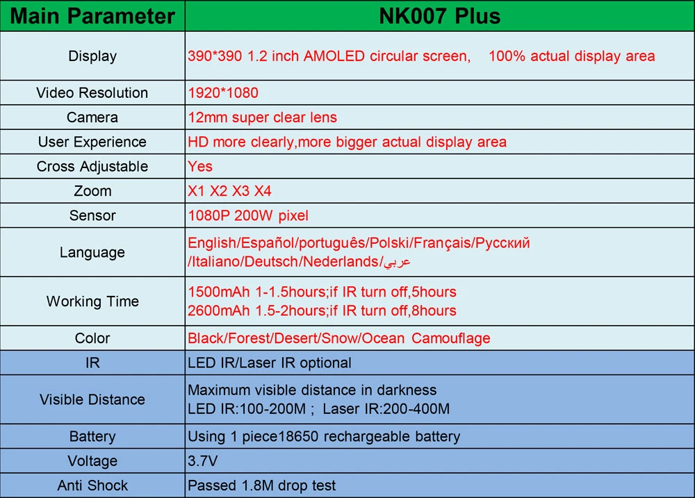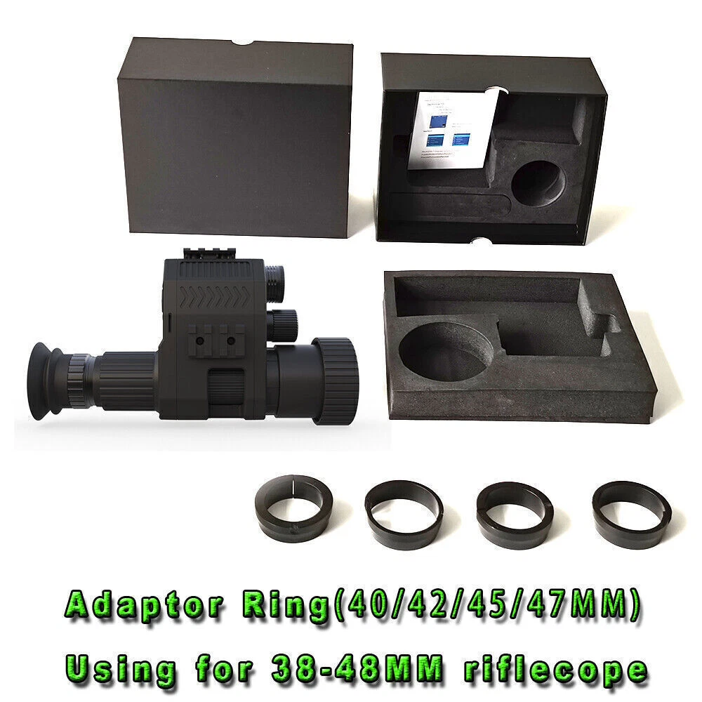 Megaorei NK007 Plus (1080p) Advantages Infrared technology provides stealth: Infrared is not visible to the naked eye, so you become completely stealthy in the dark.940 is more covert than 850. Internal High Definition Screen: Comes with a built-in 1.2-inch HD screen that reduces eye strain and gives you crystal clear vision even on the darkest nights. Adjustable brightness and contrast to suit your needs. Crosshairs on the screen give you pinpoint accuracy. Scope attachments: This product comes with multiple scope attachments and protective tape. Ideal for a variety of applications such as night hunting, wildlife viewing and cave exploration. Easy to use: Our night vision system can be easily mounted to your scope with minimal effort. Built-in DVD: record audio/video Megaorei Infrared Night Vision Rifle Scope Hunting Sight Laser IR HD Cam 940nm SAFE & SECURE SHOPPING 100% SATISFACTION GUARANTEED FAST SHIPPING Real US Warehouse Sellers !!! 100% Brand New and High Quality 2024 Newly Upgraded SHIP From US Local Stock Same day dispatch with Tracking Number ⭐ 2-5 day arrival FREE Return, Seller Pay QUICKLY Reply within 24 Working Hours ANY PROBLEM please email us before feedback, thanks! Megaorei NK007 Plus (1080p) Advantages Infrared technology provides stealth: Infrared is not visible to the naked eye, so you become completely stealthy in the dark.940 is more covert than 850. Internal High Definition Screen: Comes with a built-in 1.2-inch HD screen that reduces eye strain and gives you crystal clear vision even on the darkest nights. Adjustable brightness and contrast to suit your needs. Crosshairs on the screen give you pinpoint accuracy. Scope attachments: This product comes with multiple scope attachments and protective tape. Ideal for a variety of applications such as night hunting, wildlife viewing and cave exploration. Easy to use: Our night vision system can be easily mounted to your scope with minimal effort. Built-in DVD: record audio/video and take photos. Supports up to 32GB TF card : not included: for hours of HD recording time! Technical data: Main parameters: 940 NK007 Plus Display: 390*390 1.2 inch AMOLED round screen 100% actual display area Videoauflösung: 1920*1080 Camera: 12 mm super clear lens User Experience: HD clearer, larger actual display area Cross adjustable: Yes Zoom: X1 X2 X3 X4 Sensor: 1080P 200W Pixel Language: English / Español / portugiesuês / Polski / Français / Pycc K: : / Italiano / German / Nederlands Working time: 1500mAh 1-1.5 hours; when IR is off, 5 hours 2600mAh 1.5-2 hours; when IR is off, 8 hours Color: Black/Camo Green IR: 940Laser IR Visible distance: Maximum visible distance in darkness LED IR: 100-200M \ Laser IR: 200-400M Battery: Use 1 piece rechargeable battery : not included: Voltage: 3,7 V Anti-shock: Passed 1.8M drop test NIGHT VISION FOR HUNTING AND PEST CONTROL. With this compact, light-weighted, integrated, flip-up rear night vision scope, you can quickly and easily transform your normal riflescope into a state-of-the-art night vision scope. It is an offering for a variety of applications such as surveillance, night hunting, wildlife viewing and cave exploration, pest control and so on. FULL SCREEN DISPLAY, WIDER VIEW NightCrystal 4B NK007 Plus night vision camcorder features full screen display, you can see exactly what you see in the scope! It is equipped with a 12mm IR camera, which means the view is wider than NightCrystal 3, which uses a 16mm IR camera). 1-4 TIMES DIGITAL ZOOM With the NightCrystal 4B NK007 Plus night vision video camera's magnification function, you can select suitable magnification times (1x, 2x, 3x, 4x available) through the operation menu. 1080P VIDEO RECORDING Just click the video record button or photo record button of NightCrystal 4B night vision scope camera, you can record the hunting video or take photo with 1920*1080p HD resolution, no matter day or night, and you can share your hunting experience with your friends, show yourself on your social network. COMPLETELY STEALTH An energy-efficient 3W IR flashlight is integrated into the night vision clip-on attachment, this infrared flashlight makes night vision brighter and clearer. It is invisible to the naked eye and keeps your position hidden. You can adjust the intensity of the IR light by pulling back or stretching the head of the IR flashlight. And the direction of the IR flashlight is adjustable, so you can overlap the IR light well to brighten up your vision. SUPER SHOCKPROOF When shooting outdoors, there is a lot of play, poor quality or DIY products. After prolonged use, some components may come loose, causing the equipment not to work properly. We use silicone materials to protect important components that can be easily damaged by strong impact. This silicone packaging design gives NightCrystal 4B a super anti-shock function. It has passed 1.8m drop test! It has 0.308 caliber rifles recoil rating! UP TO 400 METERS VIEWING DISTANCE IN PITCH DARKNESS The integrated 1.2-inch HD screen on the eyepiece shows you colorful image in daytime vision and black and white image in night vision in complete darkness. You can see everything crystal clear in complete darkness up to 400 meters. No more DIY needed, ideal for beginners. There are two types of built-in IR flashlights to choose from: LED IR flashlight visibility range at night: up to 100 meters; LASER IR flashlight visibility range at night: up to 400 meters; Tips: 1. due to manual measurement, please accept 1-3cm error. 2. due to the difference of light and screen, the color of the product may be slightly different from the picture. Packing List: 1 x Megaorei NK007 Plus Night Vision Kit. (With 32g Card+Battery+Charger) 1 x Manual 4x inner rings (40mm/42mm/45mm/47mm use for 38-48mm scope). Payment Delivery details Terms of sales About us Contact us Payment We accept PayPal,ebay payment. Please make sure your address is correct before you pay. Feedback will be left automatically after we receive