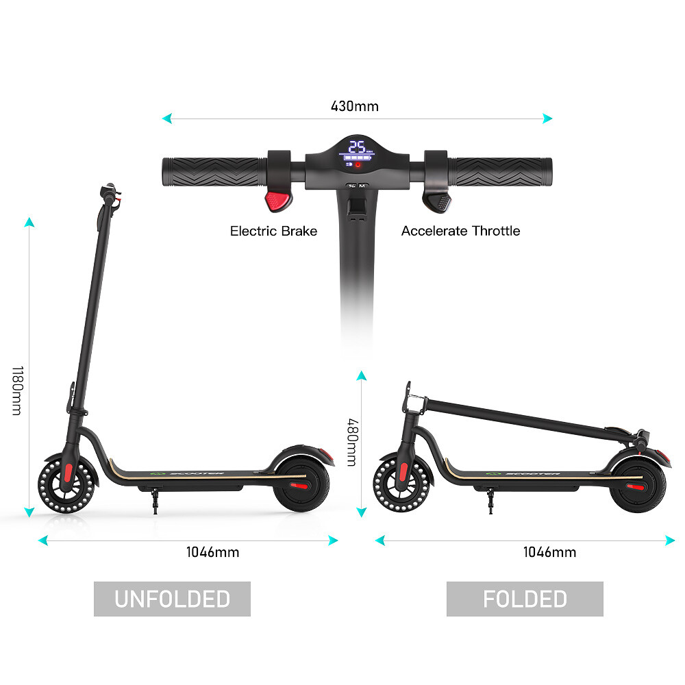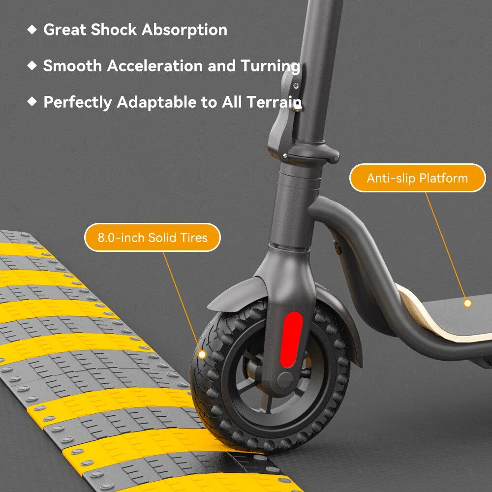 Features: 【 Anti-puncture solid tires 】The electric scooter uses 8.0-inch honeycomb shock-absorbing tires with high elasticity and wear resistance. The honeycomb tire does not require inflation, repair, maintenance.And it's don't worry about punctures.It also has a good anti-slip effect. 【 5.0 AH large capacity battery and more battery life 】Fitted with 5.0 Ah lithium-ion battery, the scooter can provide long full mileage 8-12km, up to 12km range.Full charged for only 3-4 hours, will hold climbing ability 20 degrees. 【 Three gears with headlight & rearlight 】Three gears (6.25MPH=10KM/H, 12.5MPH=20KM/H, 15.5MPH=25KM/H), easy to change through a button on the LED display which also shows the battery and the gear clearly. The low-speed gear prevents teenagers or children from driving too fast. LED Headlight and rearlight double insure your safety at night. 【 High level security 】This S10 electric scooter applies dual brake system (a motor electronic brake on the handlebar and a foot friction rear brake on the back wheel) with CE/UL/FCC/RoHS safety certification. The pedal is made of Malleable Maple Wooden, which is more durable. You can easily cross all kinds of roads, reduce bumps and keep you feel comfortable. 【 None-0 start 】The electric scooter applies a none-0 start for the safety consideration, please scroll for a distance to start. Features a bigger and longer deck, a double braking system, a long-range battery, and a One-step portable folding mechanism, the Megawheels electric scooters can bring a smooth and comfortable riding into your way.We provide professional technology support. Any question, just contact us, we will reply in 24 hours with satisfying solutions. 【 Delivery time and Service 】We have warehouses in the US, scooters can be delivered in 3-7 days. If you have any questions about the scooter, please feel free to contact us, we will help you in 24 hours. Specification: Brand: Megawheels Model: S10 Dimension: Unfolding 105 x 43 x 118 cm; Folding: 105 x 43 x 48 cm Net Weight: 11.9kg Color: Black Frame Material: Aluminium Tires: 8.0" Honeycomb Front Tire & Solid Rear Tire Max Load: 100kg Max speed: approx.25KM/h Speed level: Gear 1--Max 10km/h ; Gear 2--Max 20km/h; Gear 3--Max 25km/h Mileage: approx. 8-12km Grade Ability: 20 degree slope Working Temperature: -15°C-50°C Storage Temperature: -20°C-25°C Mode Type of Motor: Brushless hub motor Battery Type: High quality lithium battery Battery Capacitiy: 5.0 Ah Battery Voltage: 36V Charger Input Voltage: 100V-240V Charger Frequent: 50Hz/60Hz Charging time: approx. 3.5 hours Package Contents: 1 * Folding Electric Scooter 1 * Battery Charger 1 * User's Manual LCD Dashboard Long Battery life 8.0'' Anti-puncture Tires Three speeds (10km/h, 20km/h, 25km/h), easily changed via buttons on the LED display, also clearly showing remaining battery and headlight status. With a battery capacity of 5200mAh, this adult electric scooter has a lifespan of up to 8-12km (depending on road conditions and rider's weight), and the charging time is 3-4 hours. Honeycomb tires can prevent tire blowouts. You can drive freely on any road. You don't have to worry about tire blowouts,it can avoid trouble during driving. Before use, please kindly read the schematic diagrams and assembly steps of manual to assemble the front wheel: 1. Step on the base, lift the fork firmly to remove the base. 2. Remove the rubber plugs on both sides of the front fork, and unscrew the front axle with the two 6mm hexagon wrenches in the package. 3. When installing the front wheel (please pay attention to the direction of the tread of the tire, as shown in the lower right or the inflation port to the right), and tighten the front wheel axle. 4. Plug back the rubber plugs on both sides of the front fork. Note: Our products have been certified under UL2272 safety standards.