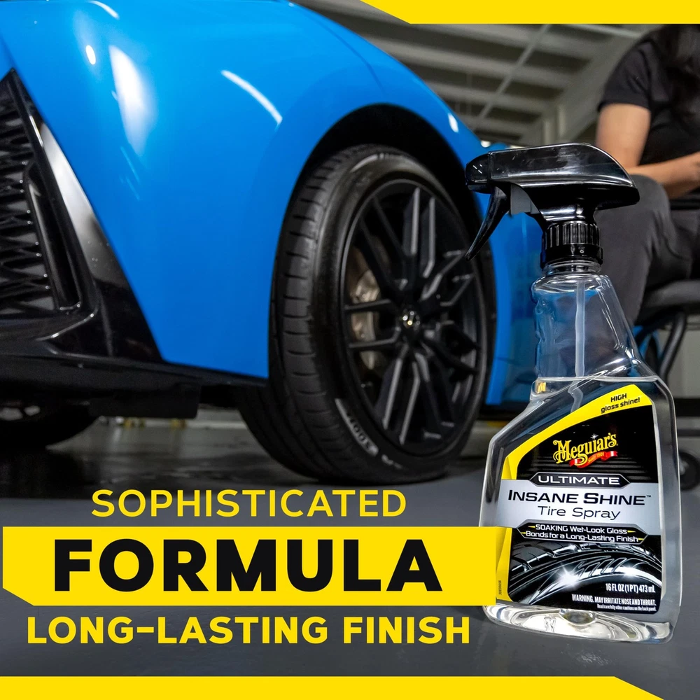 Meguiar's Ultimate Insane Shine Tire Spray - Premium 24 Ounce (Pack of 1) Description This premium formula is one of the highest gloss tire dressings that Meguiar’s makes. It’s tailored for customers who want a soaking wet-look shine for their tires. With advanced synthetic polymer chemistry, this liquid spray tire shine delivers extreme, attention-grabbing depth with amazing gloss and shine. Not only does this tire coating deliver a tremendously glossy shine, but it also contains an advanced higher molecular weight producing an amazing bond for a long-lasting finish. Another benefit is that the product allows you to obtain the type of shine you’re looking to get. For a high gloss shine, spray directly to the tire and allow it to cure. For those who prefer a medium shine, just spray onto an applicator, apply evenly to the tire, and let it cure before driving. If you are looking for a premium tire dressing that delivers an amazing bond for long-lasting shine coupled with a soaking wet-look gloss that enhances how your ride looks, Ultimate Insane Shine Tire Spray is for you! Features: HIGH-GLOSS WET LOOK: This premium tire dressing contains synthetic polymer chemistry that quickly delivers an attention-grabbing shine that lasts - give your tires a durable black, wet-look shine LASTING FINISH: An advanced higher molecular weight formula helps to deliver a long-lasting finish. This premium car tire shine not only provides an amazing wet-look shine, but it's a finish that sticks to your tires and lasts GET THE SHINE YOU WANT: Spray directly onto tires for a high gloss shine, or if you prefer a medium shine, spray onto an applicator and evenly apply to tires. Either way, it bonds to the sidewall for a lasting shine SOAKING WET-LOOK: Do you like a lot of shine on your tires? If so, this tire dressing is for you! This spray tire dressing offers a soaking wet-look gloss that enhances the appearance of your tires and your ride EASY TO USE: Ultimate Insane Shine is a tire shine spray that is convenient and easy to use. It comes in a liquid, sprayable format that is easy for anyone to apply to their tires 125 YEARS OF INDUSTRY LEADERSHIP: In 2026, Meguiar’s celebrates its 125-year anniversary milestone; reflecting on the Brand’s evolution and influence within automotive car and professional-grade solutions — turned DIY, since 1901 Product Details: Handling We will ship all orders within 3 business day of payment. Delivery We Do Not Ship Outside of the Continental US. Return Policy All items qualify for returns within 30 days of receipt. Buyer is responsible for return shipping on any item that is not damaged. Feedback We take our reputation seriously, we buy and sell online, so we understand the value of trust. If you are unsatisfied with your order, please contact us and we will work with you to resolve it to your satisfaction.