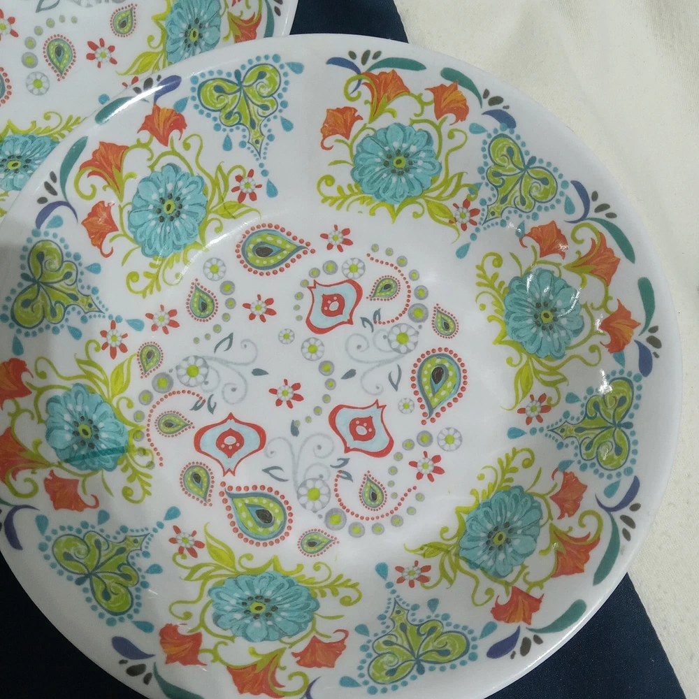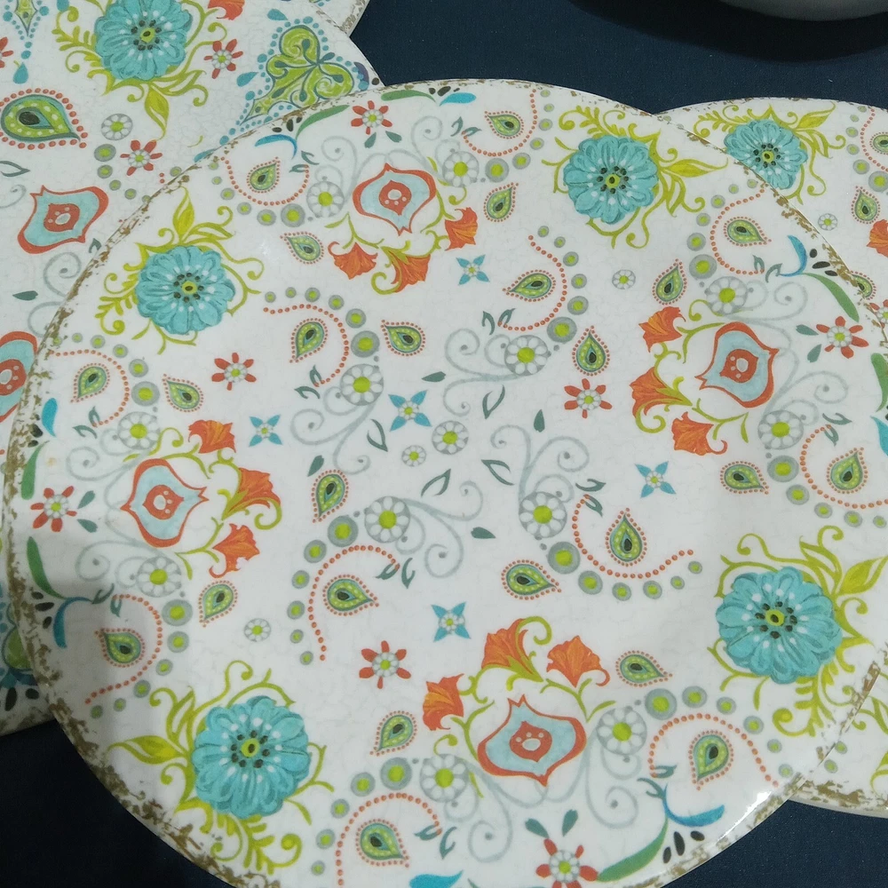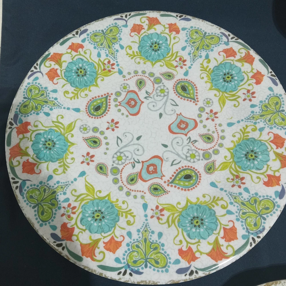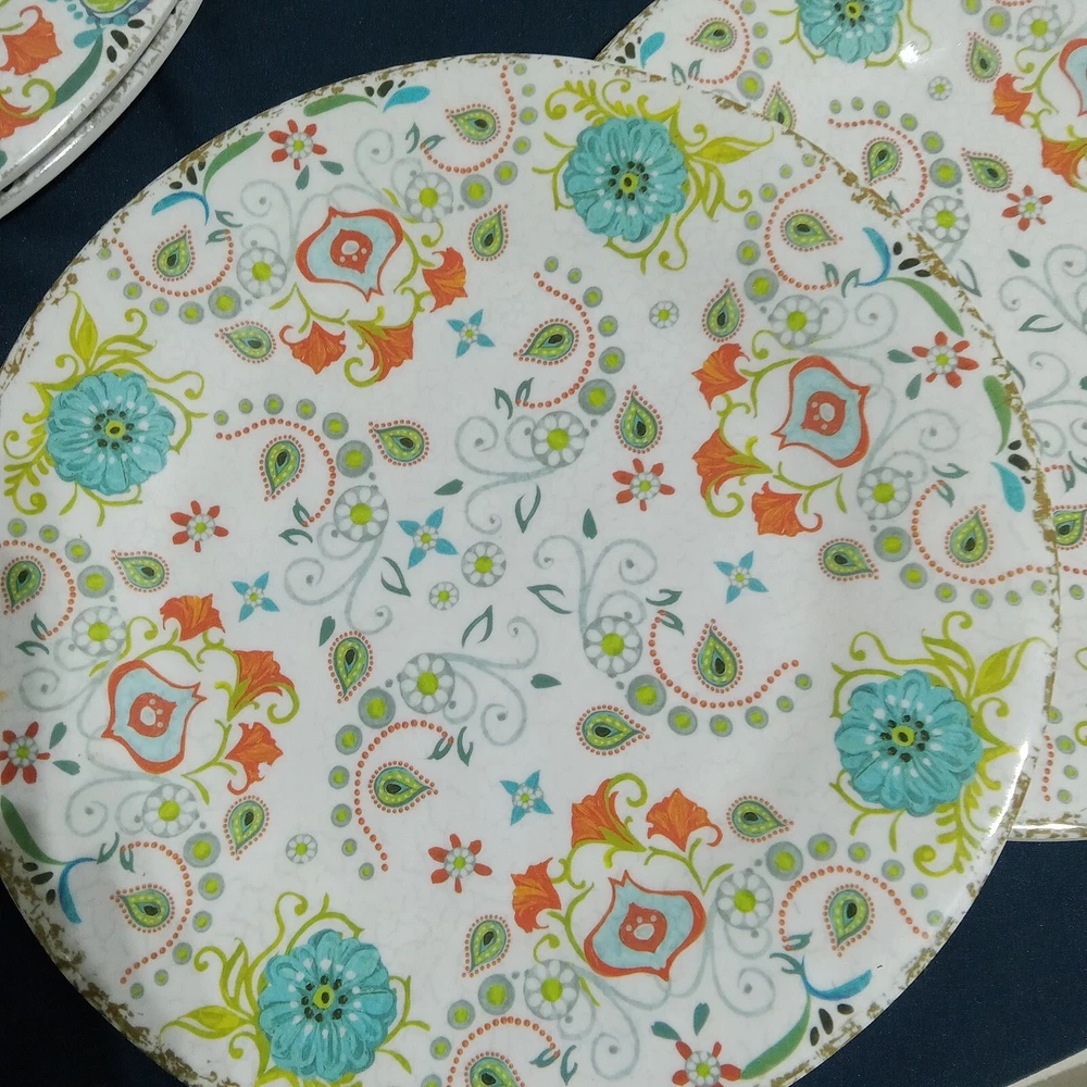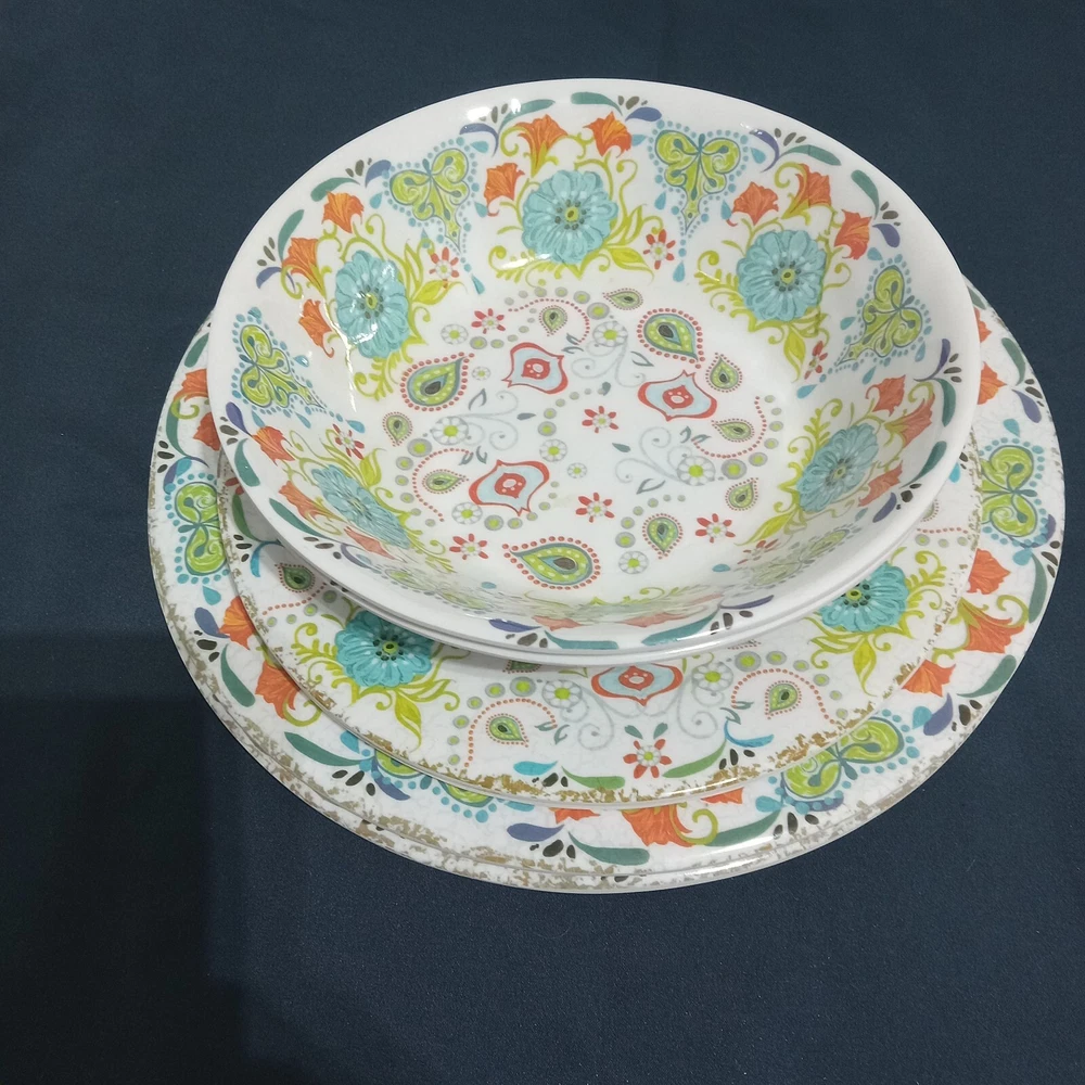 Melamine ware, service for 2. Dinner plates, sandwich or dessert plates, salad or soup bowls; 2 each. Please see photos as they are part of the description. Great condition!!